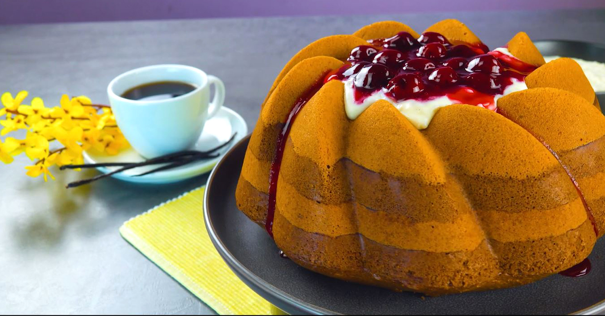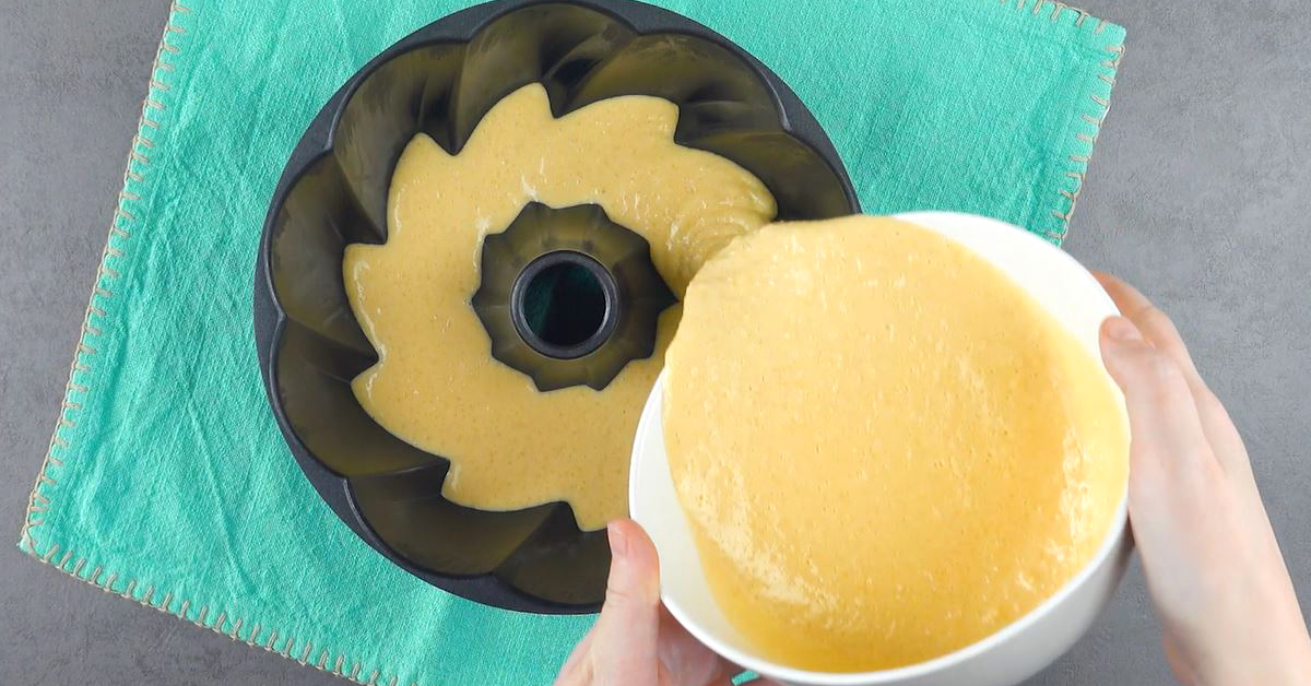 7. Backe den Kuchen für etwa 40 Minuten bei 180 °C Umluft mit Ober- und Unterhitze und stürze ihn, solange er noch lauwarm ist.