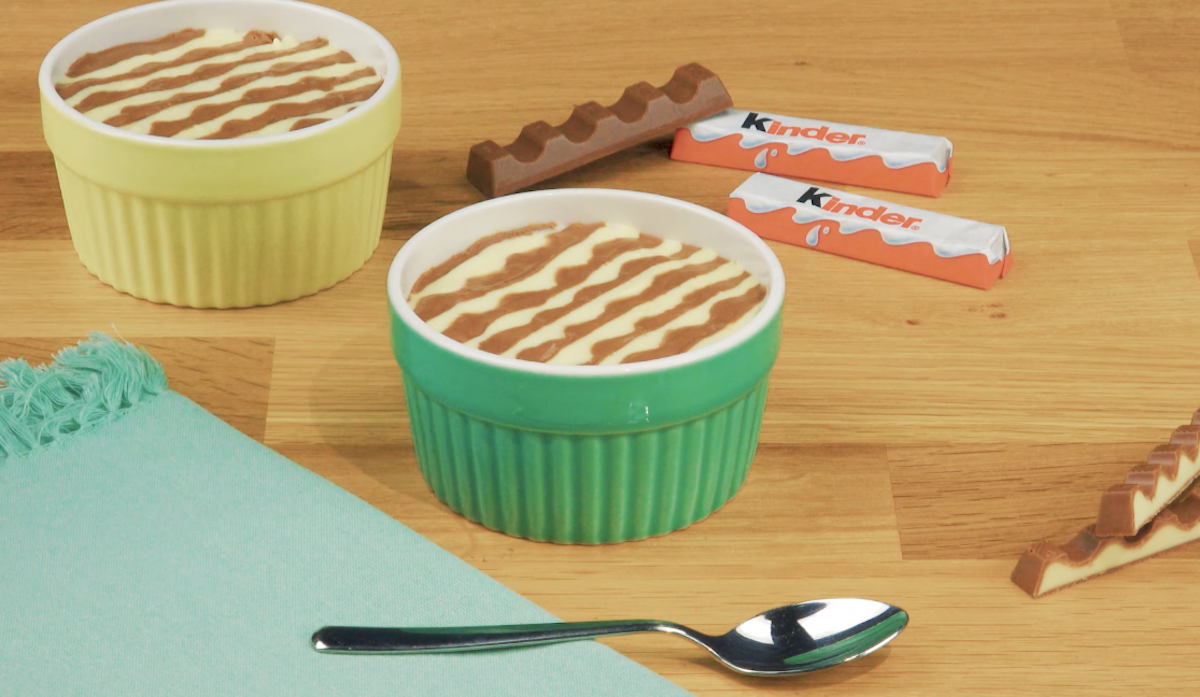3.) Fülle kleine, runde Formen zur Hälfte mit dem Teig. Perfekt eignen sich Soufflé-Formen. In deren Mitte drückst du aufrecht eine drittel Kinderschokolade. Bedecke diese mit einem Klecks Teig und backe die Formen bei 180 °C für 15 Minuten.