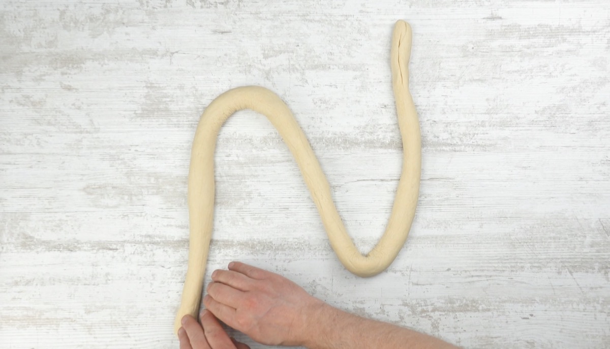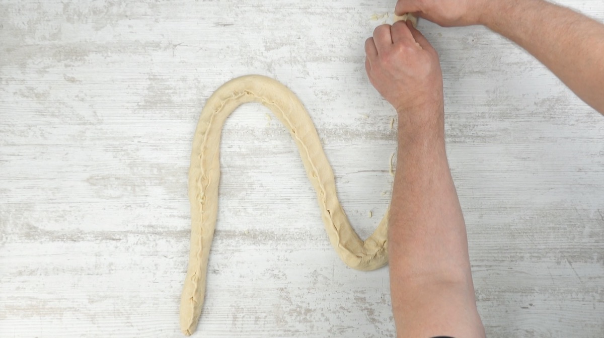 3. Drücke den Teig oberhalb des Mozzarellas zusammen. Rolle ihn anschließend vorsichtig wieder zu einer Schlange, sollte er sehr aus der Form geraten sein.