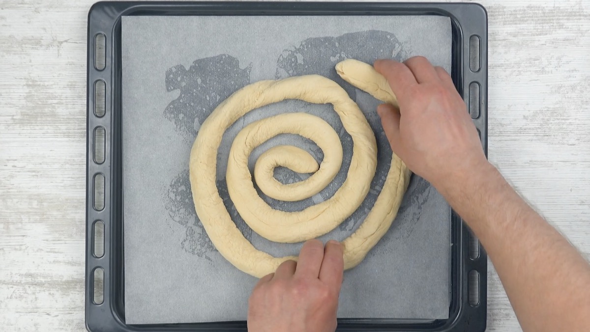 4. Forme den Pizzateig auf einem mit Backpapier ausgelegten Backblech zu einer Spirale.