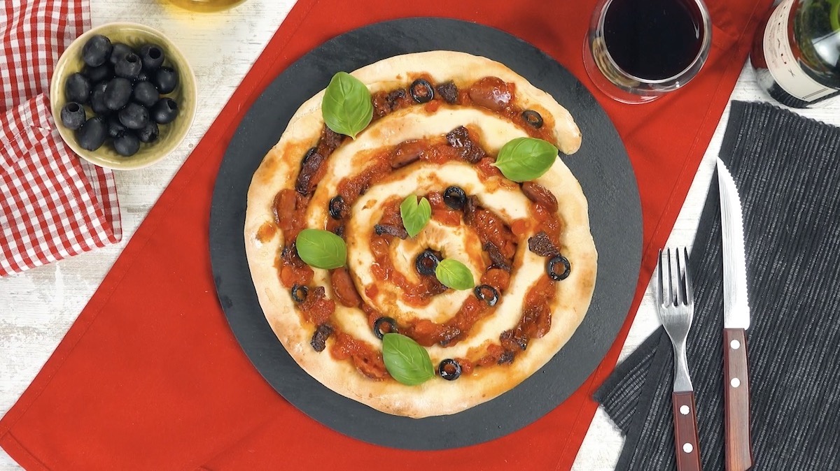 Dieses Rezept ist der beste Beweis dafür, dass es gar nicht so kompliziert ist, Pizza selber zu machen. Unsere spiralförmige Pizza sieht nicht nur hübsch aus, sondern schmeckt auch noch hervorragend, nicht zuletzt dank des herrlichen Mozzarellas im Teig. Ist dein Interesse geweckt? Dann ran an den Pizzateig, denn belegen kannst du dieses Meisterstück ganz nach deinem Gusto.