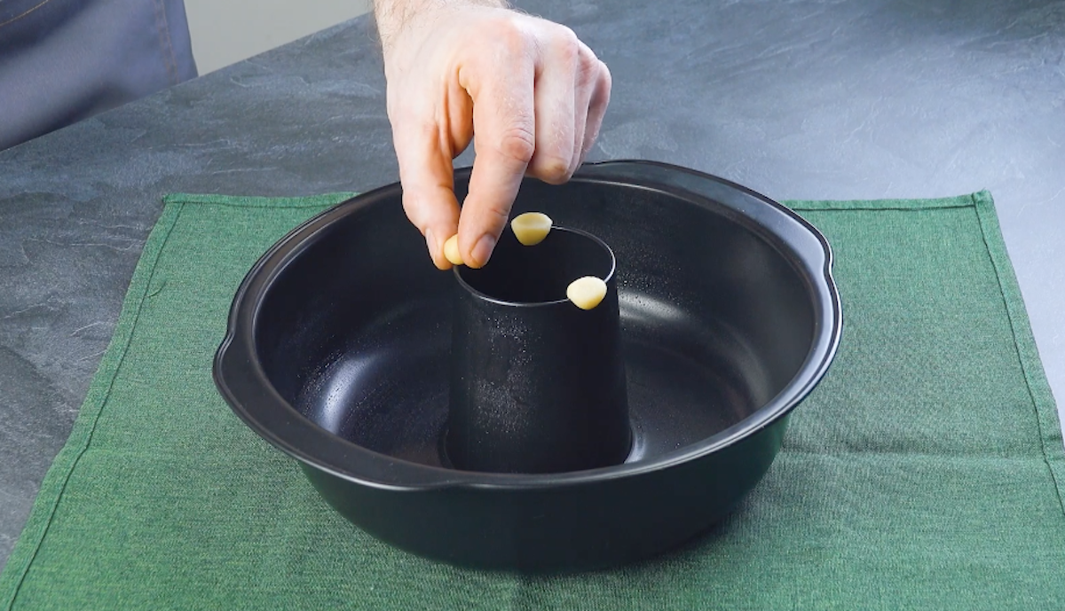 3. Fette eine Gugelhupfform ein und klopfe sie mit Mehl aus. Klebe außerdem 3 kleine Marzipankugeln in die Mitte.