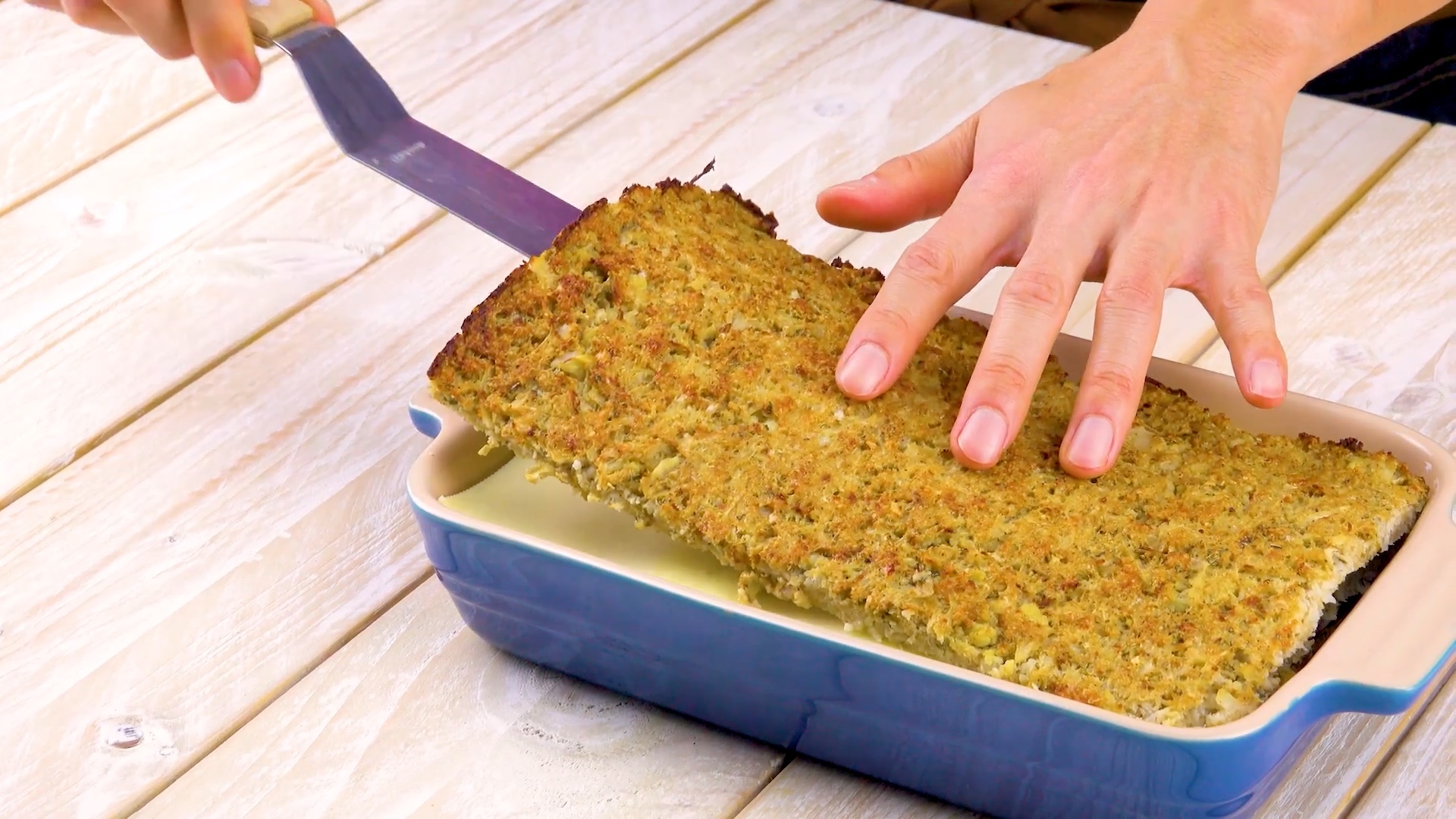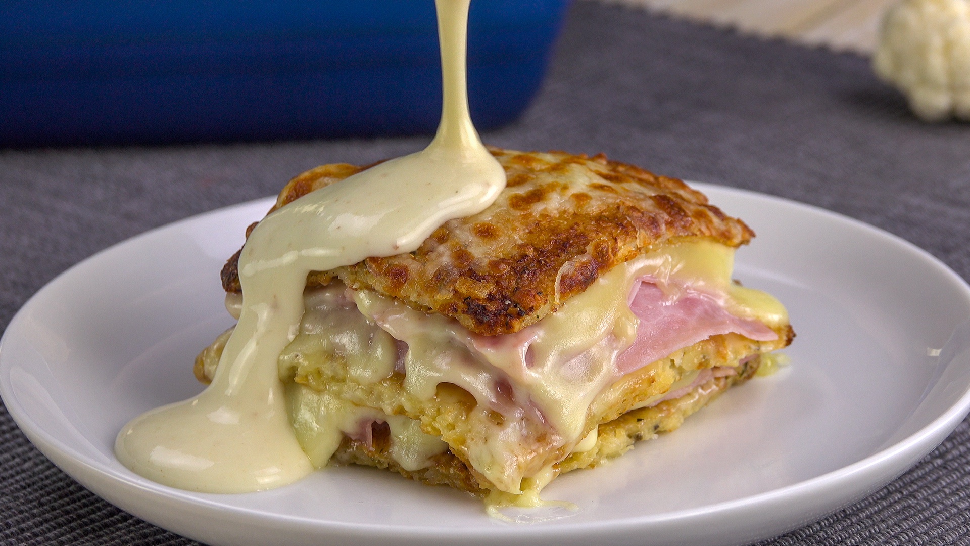 4.) Nach dem Backen schneidest du den Blumenkohl-„Blechkuchen“ in passgenaue Streifen für eine eckige Auflaufform. Lege den Boden der Auflaufform mit einem dieser Streifen aus. Decke den Streifen mit zwei Scheiben Kochschinken und sechs Scheiben Edamer ab. Lege erneut einen Streifen Blumenkohl darauf und fahre mit Schinken, Käse und einer letzten Schicht Blumenkohl fort. Streue nun Mozzarella obenauf.