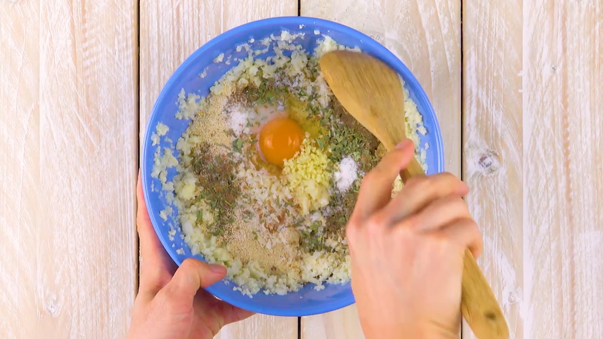 2.) Fülle die gar gekochten Röschen um und zerstampfe sie grob zu Brei. Zu diesem gibst du Semmelbrösel, Parmesan, Ei, Knoblauch, italienische Kräuter, Salz, Pfeffer und Muskat hinzu.