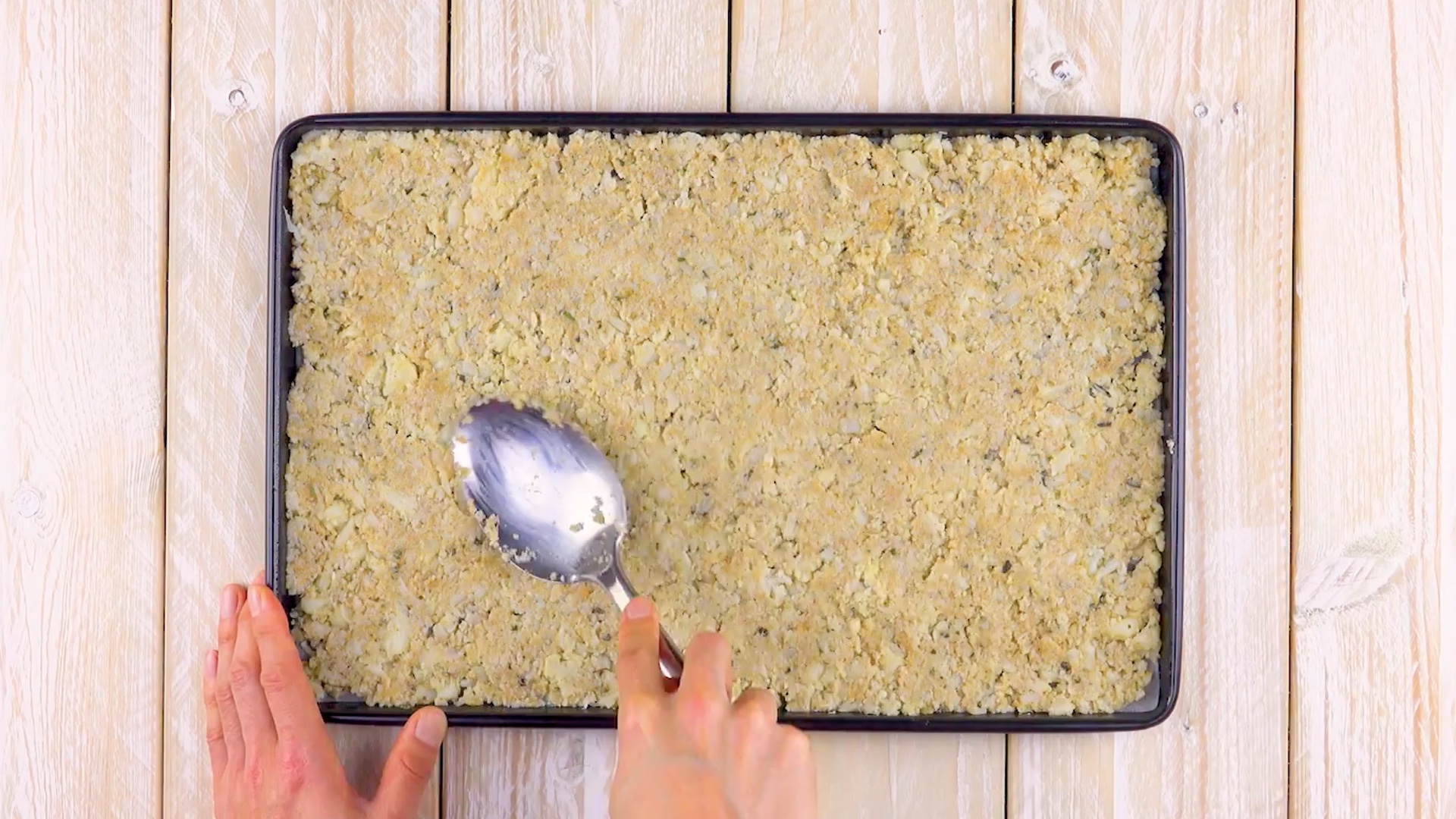 3.) Mische alle Zutaten gut und drücke die Masse auf einem mit Backpapier ausgelegten Backblech fest. Bei 220 °C (Umluft) backst du den Blumenkohl für 15 Minuten.