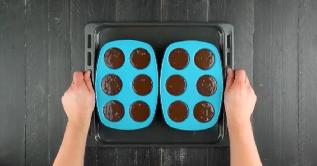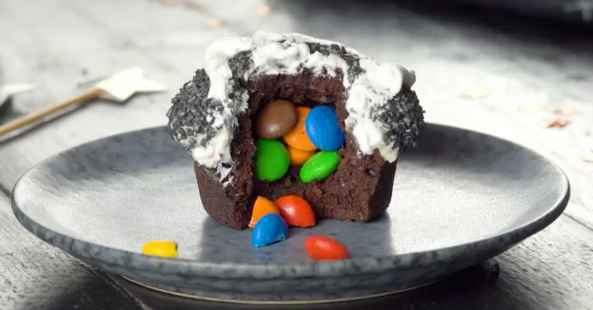 3.) Schneide einen kleinen „Deckel“ aus den Muffins heraus, höhle sie innen aus, fülle sie mit M&Ms und setze den Deckel wieder drauf.