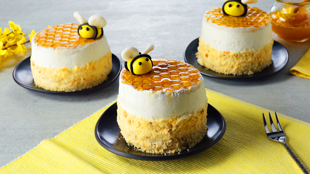 Bienen zählen neben Schweinen und Rindern zu den drittwichtigsten Nutztieren in Deutschland. Sie sorgen durch die Verteilung von Pollen für die Fortpflanzung zahlreicher Nutzpflanzen und liefern leckeren Honig. Zu Ehren der kleinen Insekten haben wir ein Rezept kreiert, das mit Mascarponecreme und Keksboden daherkommt. Probiere unsere niedlichen, geschichteten Honigkuchen, mit denen Honigfans auf ihre Kosten kommen. Die sehen nicht nur richtig niedlich aus, sie schmecken auch so, so gut.