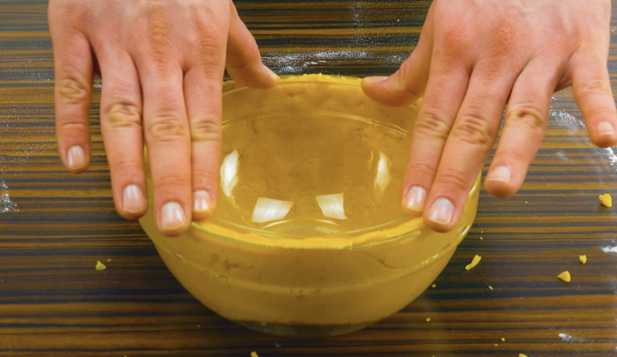 4. Den restlichen Teig (den für das Dach) rollst du erneut aus und legst ihn in eine Schüssel (Durchmesser: 18 cm). Drücke den Teig gut an die Schüsselwand und schneide den überlappenden Rand ab. Stelle außerdem eine kleinere Schüssel in die große Schüssel. Schiebe das Blech mit Teig bei 150 °C Ober- und Unterhitze für 20 Minuten und die Schüssel für 30 Minuten in den vorgeheizten Ofen. Lasse die gebackenen Wände und das Dach nach dem Backen erst einmal auskühlen.