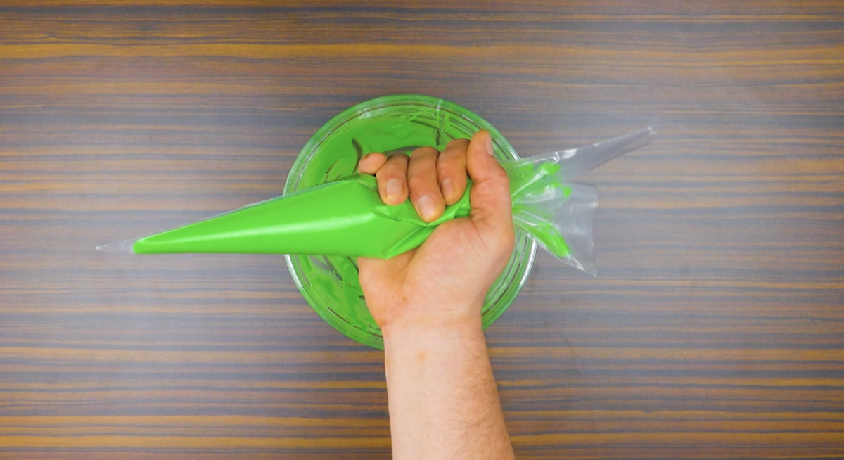 5. Für den Eiweiß-Zuckerguss verrührst du Eiweiß mit Puderzucker. Gib grüne Lebensmittelfarbe und Zitronensaft hinzu und vermenge alles nochmals gut miteinander. Fülle den Zuckerguss sofort in einen Spritzbeutel (wird schnell hart!).