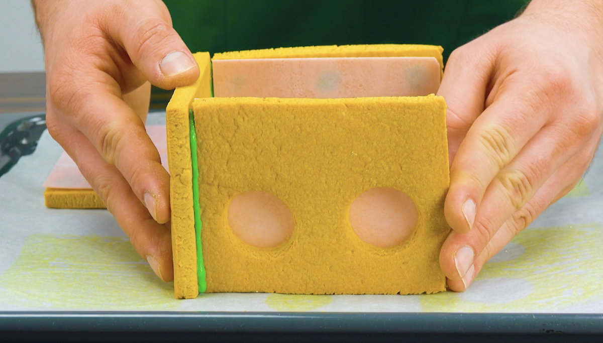 7. Drehe die gebackenen Wände einmal um, verteile auf dreien von ihnen – auf denen mit den ausgestochenen Formen – ein paar Kleckse Zuckerguss und klebe dann jeweils ein Esspapier darauf. Klebe mithilfe des Zuckergusses nun alle vier Wände zusammen und lasse den Zuckerguss etwas fest werden.