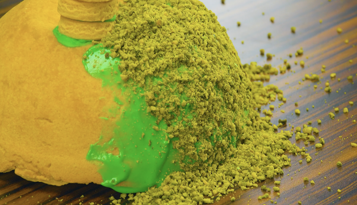6. Stelle die gebackene Halbkugel aus der Schüssel kopfüber auf die Arbeitsplatte und gib einen Klecks Zuckerguss darauf. Setze alle vier ausgestochenen, gebackenen Kreise aufeinander auf den Zuckerguss – nutze dabei den Zuckerguss als „Kleber“. Streiche die ganze Kuppel nun dünn mit dem Zuckerguss ein und verteile darauf die gemahlenen Pistazien. Drücke sie leicht an.