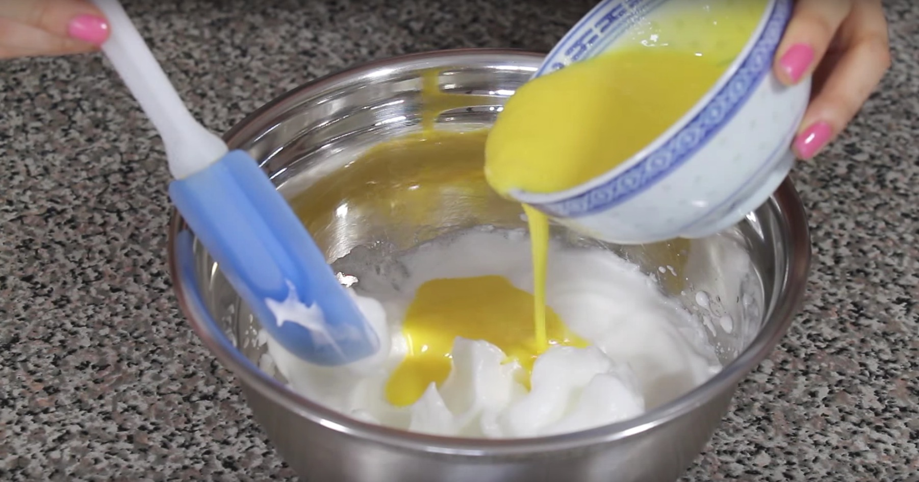Danach kommt die Eigelbmasse hinzu. Vorsichtig unterheben, damit alles locker bleibt.