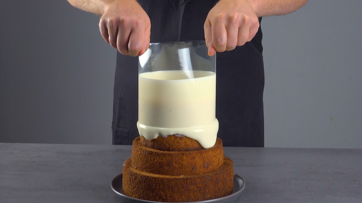 4. Löse die Kuchen aus den Springformen und staple sie auf einer tiefen Kuchenplatte. Um den Kuchen gleichmäßig mit der Glasur überziehen zu können, empfehlen wir, den obersten Kuchen mit Tortenfolie zu umwickeln, diese mit Klebestreifen zu fixieren und die Glasur vorsichtig hineinzugießen. Ziehst du die Tortenfolie dann behutsam ab, wird der mehrschichtige Kuchen gleichmäßig von der Glasur überzogen.