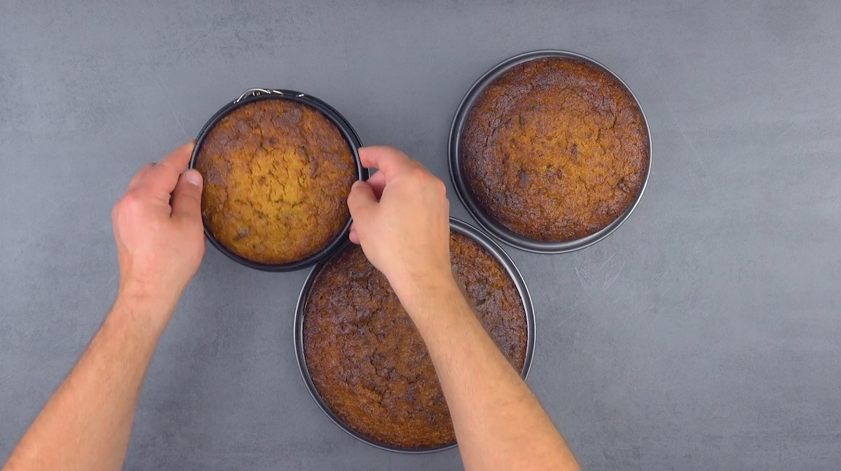 2. Teile den Teig auf drei unterschiedlich große, eingefettete Springformen auf und backe die Kuchen für 60 Minuten bei 150 °C Umluft. Lass die Kuchen anschließend auskühlen. Achtung: Die kleineren Kuchen benötigen etwas weniger Zeit zum Backen; teste am besten regelmäßig mit einem Holzstäbchen, ob sie schon fertig sind.