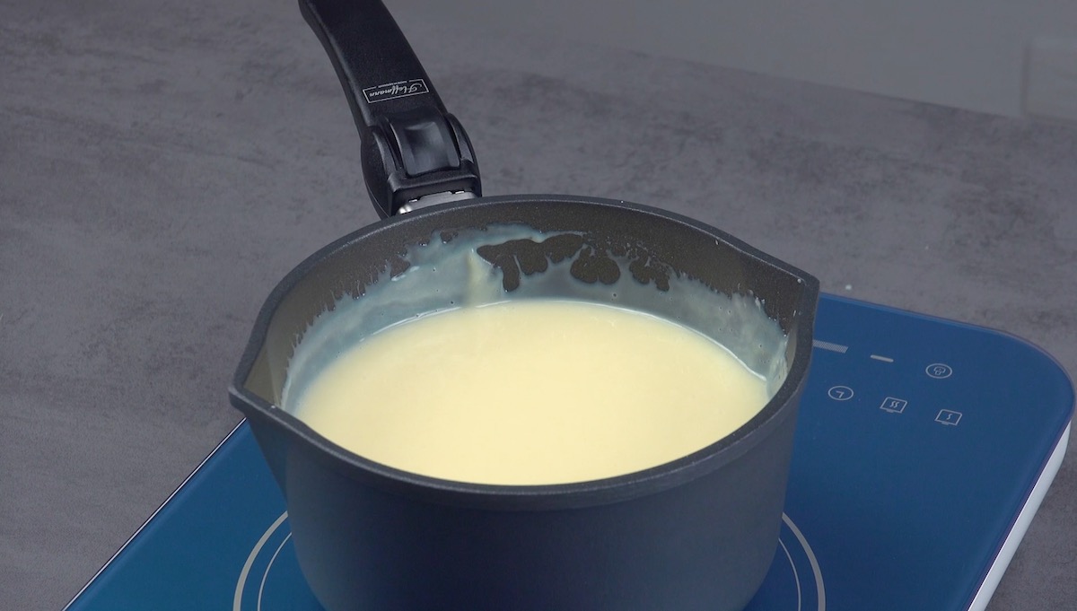 3. Koche für die Glasur Sahne, Milch und Stärke miteinander auf. Rühre dann die weiße Schokolade hinein und warte, bis sie geschmolzen ist. Weiche in dieser Zeit die Gelatine kurz in Wasser ein und rühre dann die Gelatine sowie die Kondensmilch mit in die Sahne-Milch-Mischung. Lass die Glasur anschließend abkühlen, idealerweise auf 22 bis 24 °C.