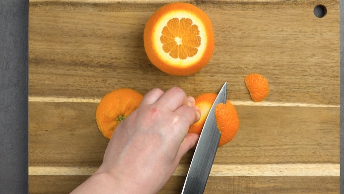 8.3) Schneide das Fruchtfleisch der Orange mit einem Messer an der Schale entlang heraus. Entferne es und schneide es in Würfel.