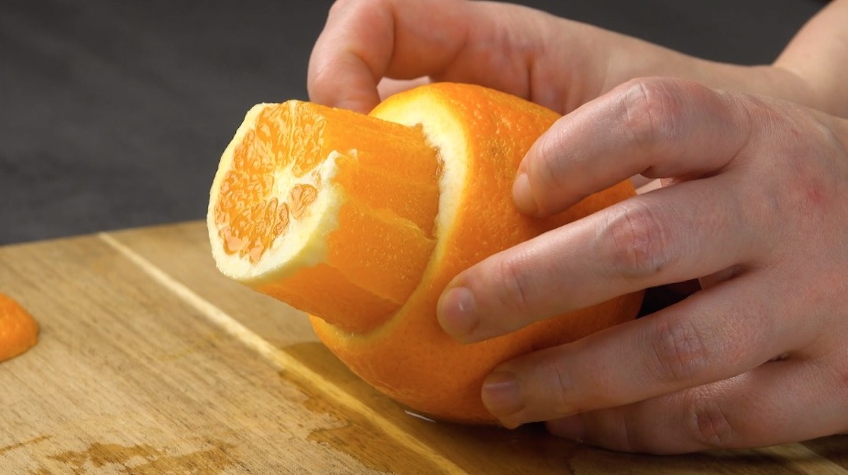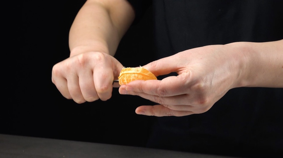 So geht es: 3.1) Schäle eine Mandarine und halbiere die einzelnen Stücke.
