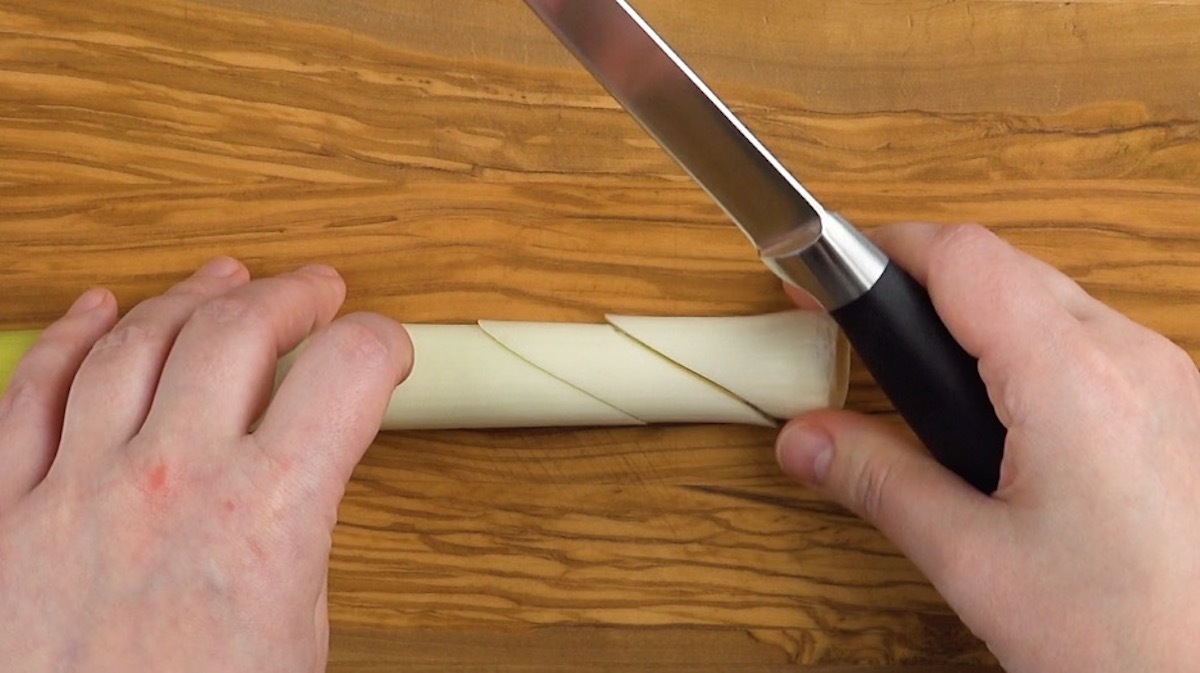So geht es: 7.1) Schneide den Lauch schräg in Rauten.