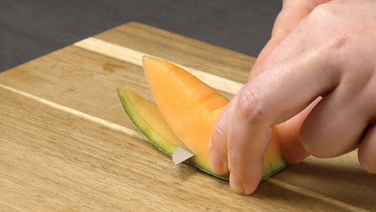 5.2) Schneide das Fruchtfleisch an der Melonenschale entlang ein, aber nicht bis zum Ende. Wichtig ist, dass das Fruchtfleisch noch an der Schale bleibt. Die „Flügel“ kannst du etwas zuschneiden.