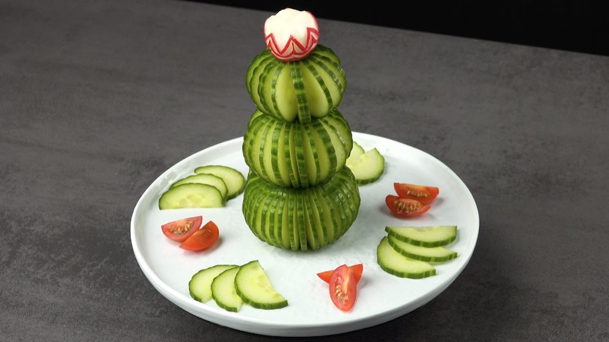 2.2) Baue nun einen kleinen Turm aus weiteren Gurkenkränzen. Ein zur Blüte geschnitztes Radieschen kommt als Letztes auf den Turm.