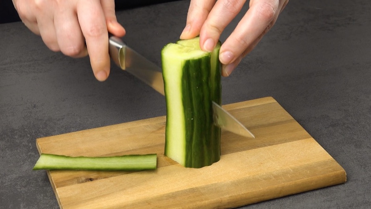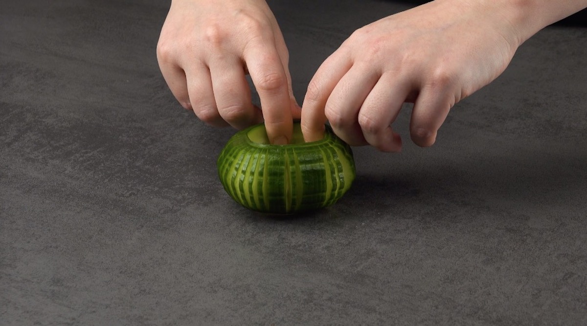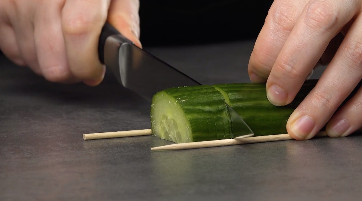 So geht es: 2.1) Schneide 2/3 von einer Gurke ab und halbiere sie längs. Platziere neben der Gurkenhälfte zwei Schaschlikspieße. Schneide die Gurke in gleichmäßigen Abständen (etwa 0,5 cm) bis zu den Spießen ein. Die beiden Spieße helfen dir, die Gurke nicht komplett durchzuschneiden. Wiederhole das Ganze mit anderen Gurkenhälften.