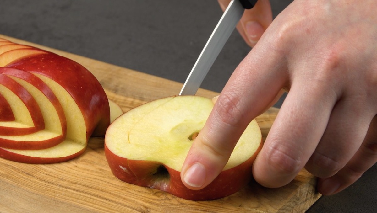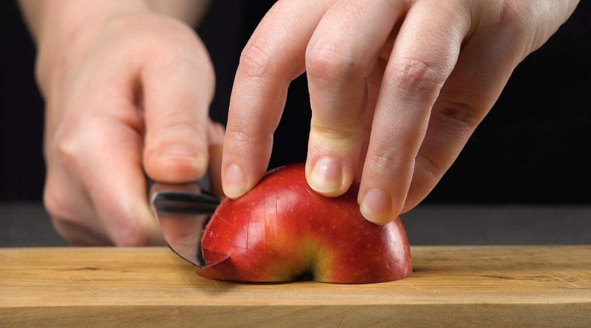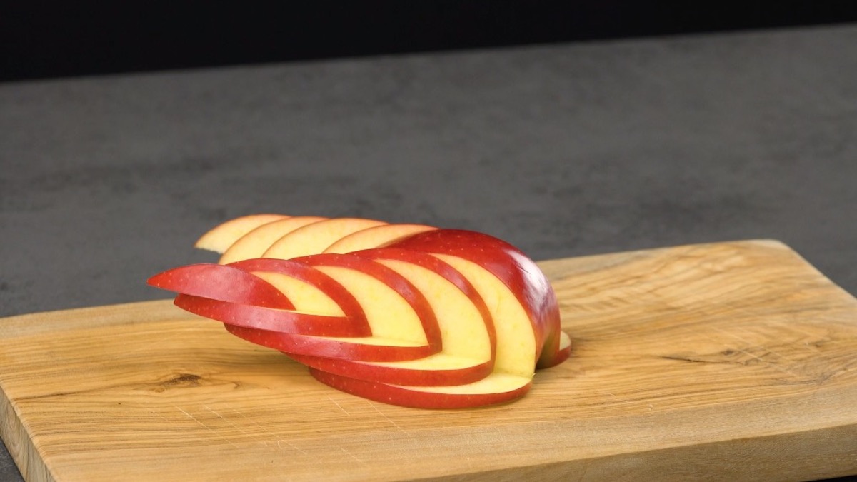 So geht es: Schneide um den Stielansatz herum auf vier Seiten mehrere ineinanderliegende Keile aus dem Apfel. Fächere sie auseinander.