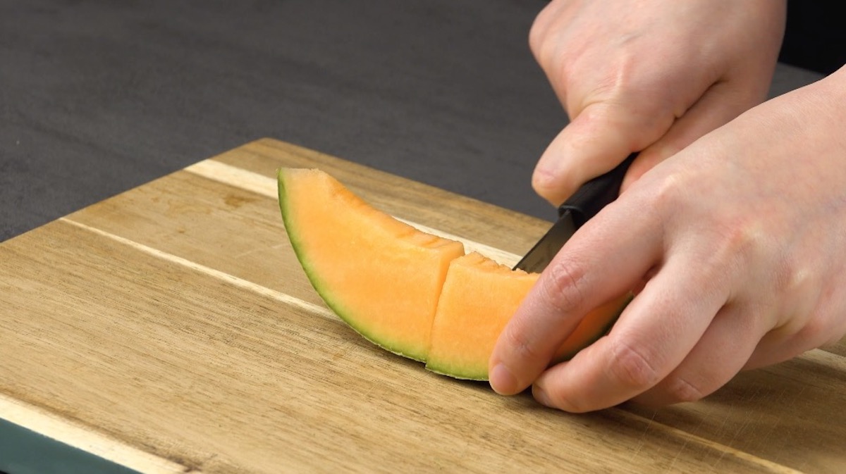 So geht es: 5.1) Halbiere eine Netzmelone, kratze das Kernfleisch heraus und schneide sie in Spalten. Halbiere diese Spalten noch einmal quer.