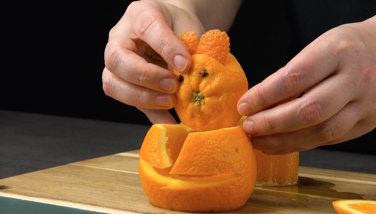 8.4) Schneide einen Keil und einen Spalt aus der Orangenschale, sodass zwei Arme entstehen. An der Rückseite schneidest du ein wenig ein, damit du den Kopf fixieren kannst. Fülle mit den Orangenwürfeln den Bauch des Bären.