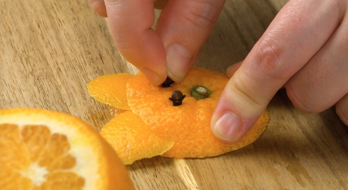 8.2) Den Orangendeckel schneidest du an der Oberseite etwas ein und steckst die Ohren hinein. Darunter drückst du zwei Nelken als Augen in den Deckel. Der Strunk ist die Nase. Fertig ist das Bärengesicht.