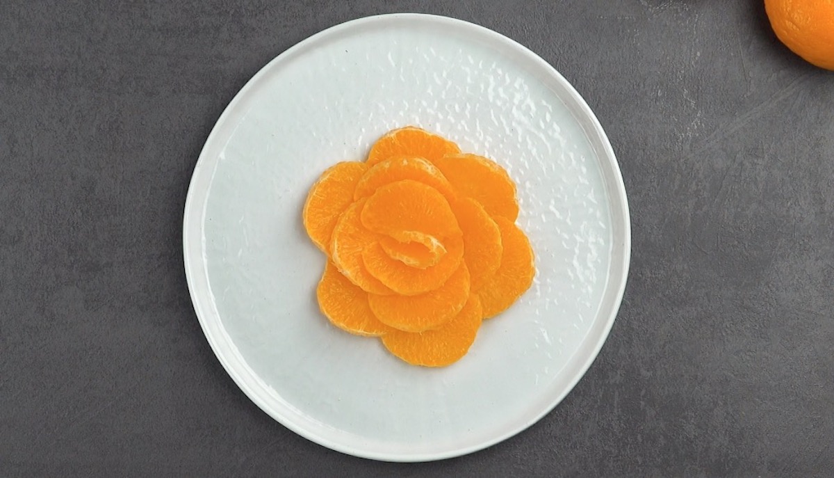 3.2) Lege die halbierten Stücke blütenförmig aufgefächert auf einen Teller.