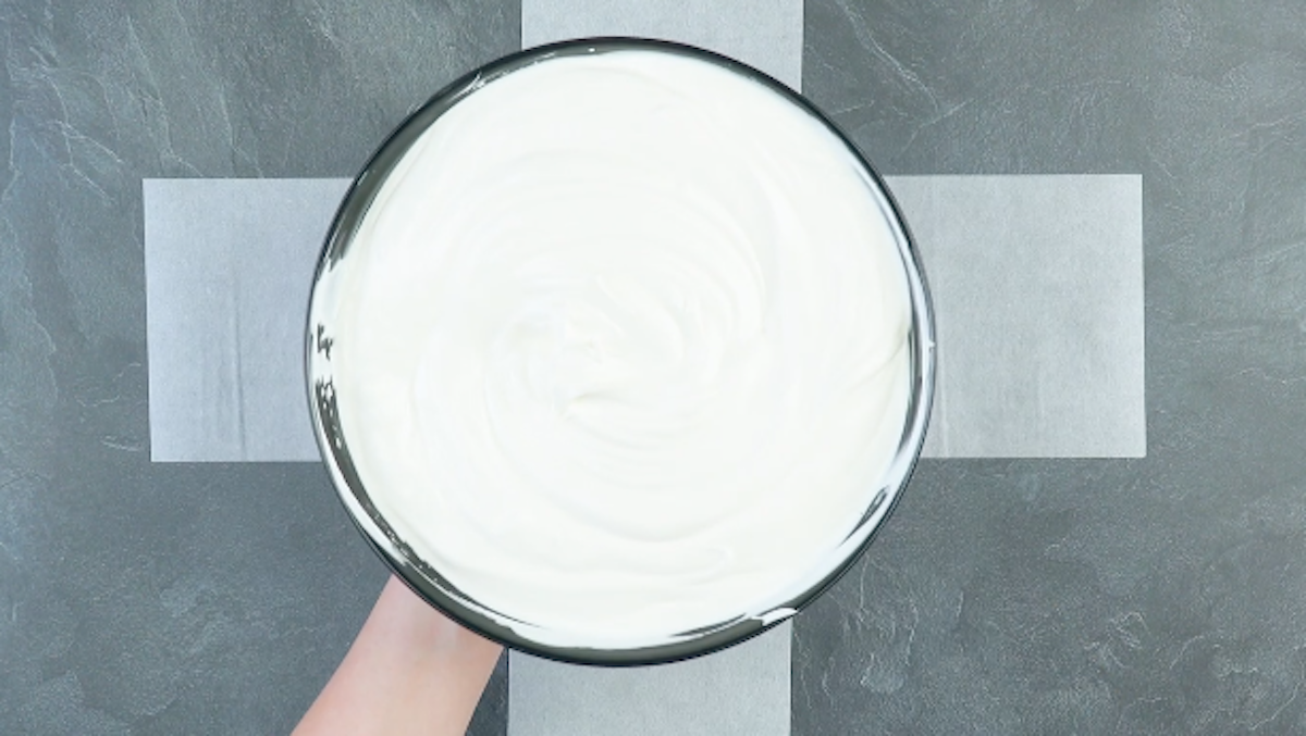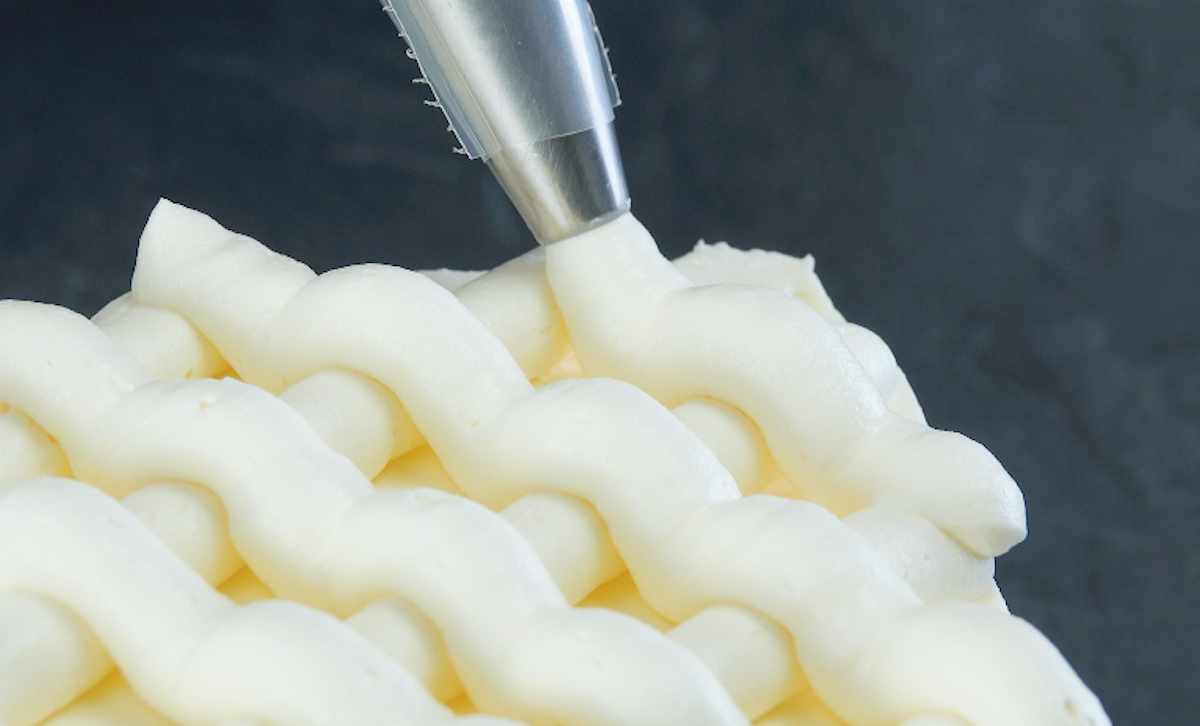 4. Verkleide nun den Kuchen rundherum mit der weißen Schokocreme. Die restliche Creme füllst du in einen Spritzbeutel und spritzt sie in einem Gittermuster auf den Kuchen.