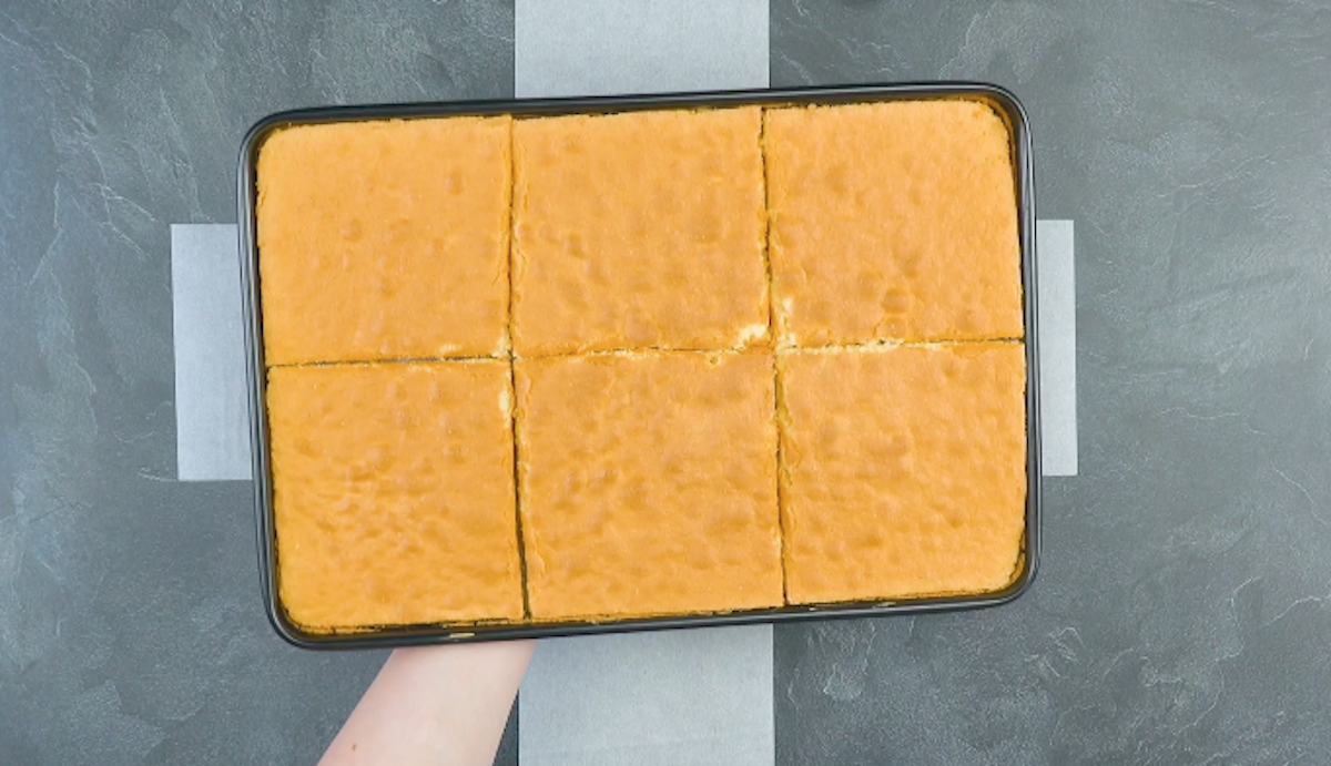 So geht es: 1. Als Erstes bereitest du den Biskuitteig zu. Schlage die Eiweiße mit Zucker schaumig und gib nach und nach die Eigelbe hinzu. Vermische Mehl mit Backpulver und rühre diese Mischung abwechselnd mit Milch unter den Eischnee. Lege ein Backblech mit Backpapier aus und backe den Teig bei 180 °C Umluft etwa 12 Minuten, bis er goldbraun ist. Lasse den gebackenen Biskuitteig abkühlen und schneide ihn in 6 gleich große Quadrate.