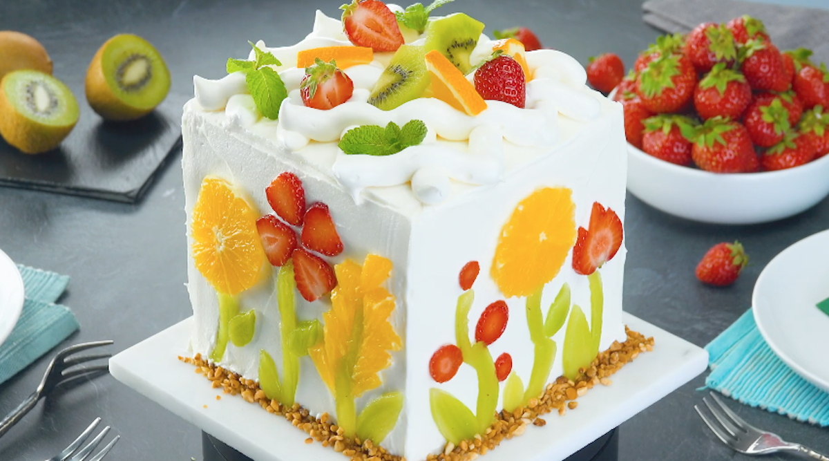 Dekoriere den Kuchen noch mit übrig gebliebenen Früchten und frischer Minze. Streue um den Kuchen herum noch ein bisschen Haselnusskrokant. Dieser florale Obstkuchen ist schon fast zu schön, um gegessen zu werden. Wenn du noch mehr besondere Obstkuchen backen willst, probiere unbedingt auch diese leckere Kuppel aus Obst, Sternfrucht, Kiwi und Joghurt.