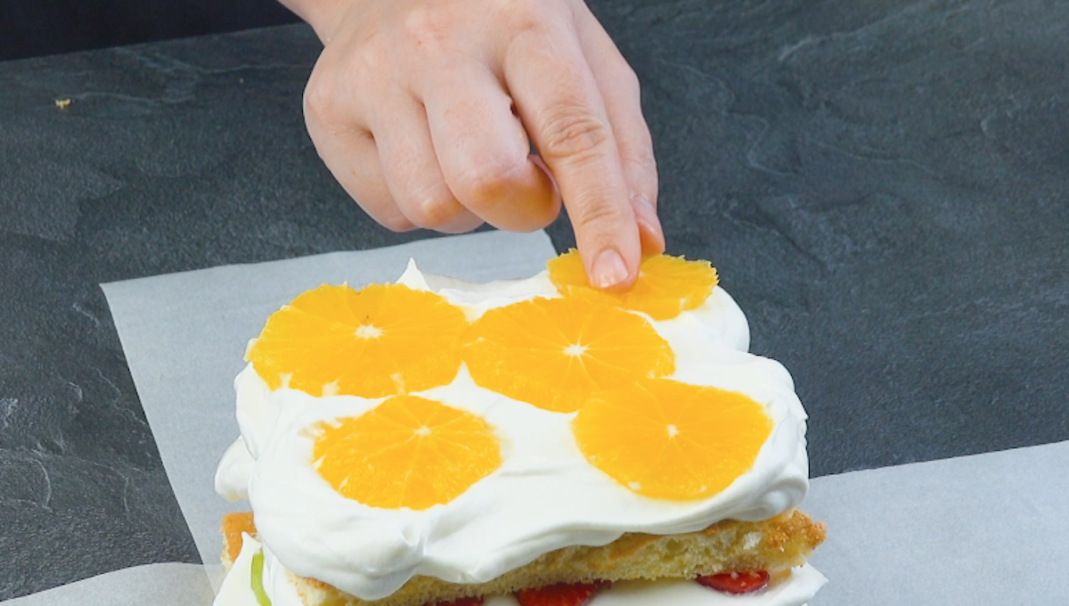 3. Lege zwei länglich-rechteckige Streifen Backpapier über Kreuz vor dich hin und platziere in die Mitte den ersten Biskuitboden. Schneide dann Kiwis, Erdbeeren und Orangen in Scheiben. Verteile etwas von der weißen Schokocreme auf dem Biskuitteig und lege ein paar Scheiben Kiwis auf die Creme. Nun wird der Kuchen in folgender Reihenfolge geschichtet: Biskuitboden, Creme, Erdbeeren, Biskuitboden, Creme, Orangen, Biskuitboden, Creme, Erdbeeren, Biskuitboden, Creme, Kiwis, Biskuitboden.