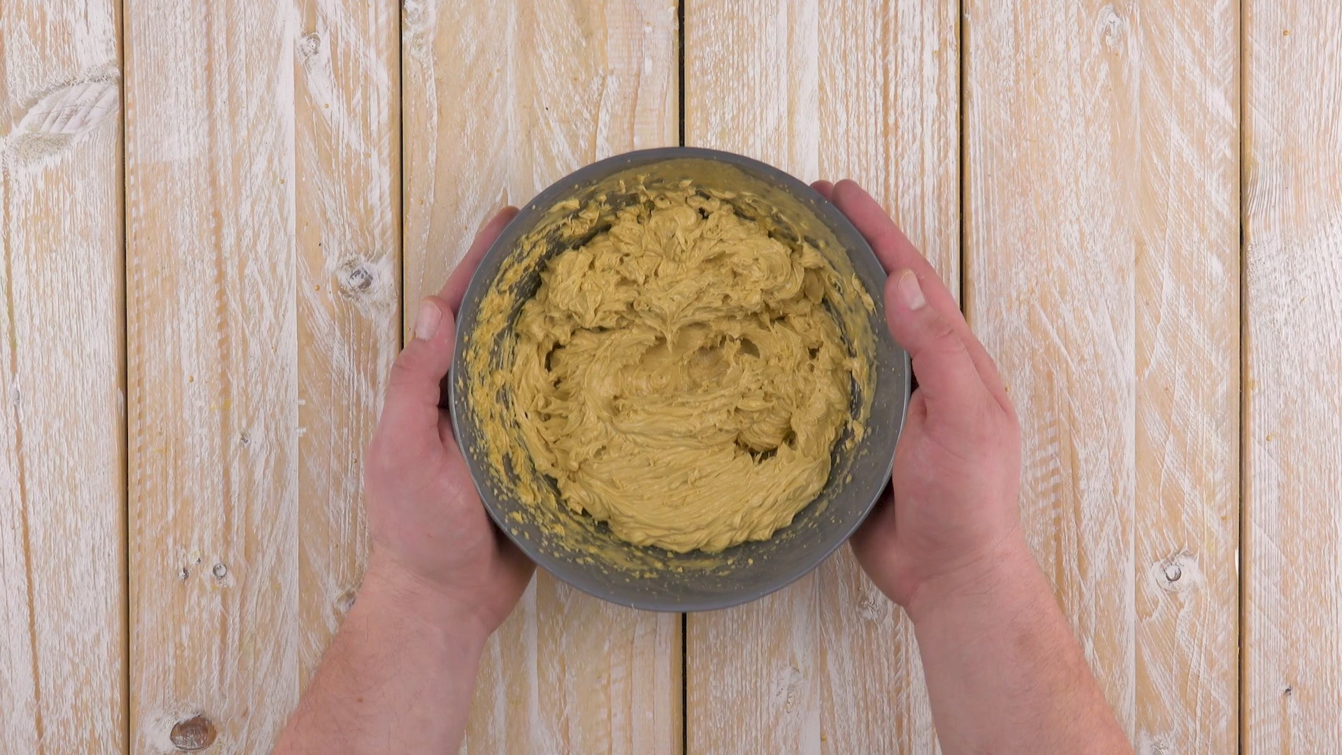 1.) Verrühre zunächst die Eier mit einem Handrührgerät mit den gemahlenen Mandeln und dem Puderzucker. Rühre dann die flüssige Butter ein. Als Letztes hebst du vorsichtig Mehl und Eischnee unter.