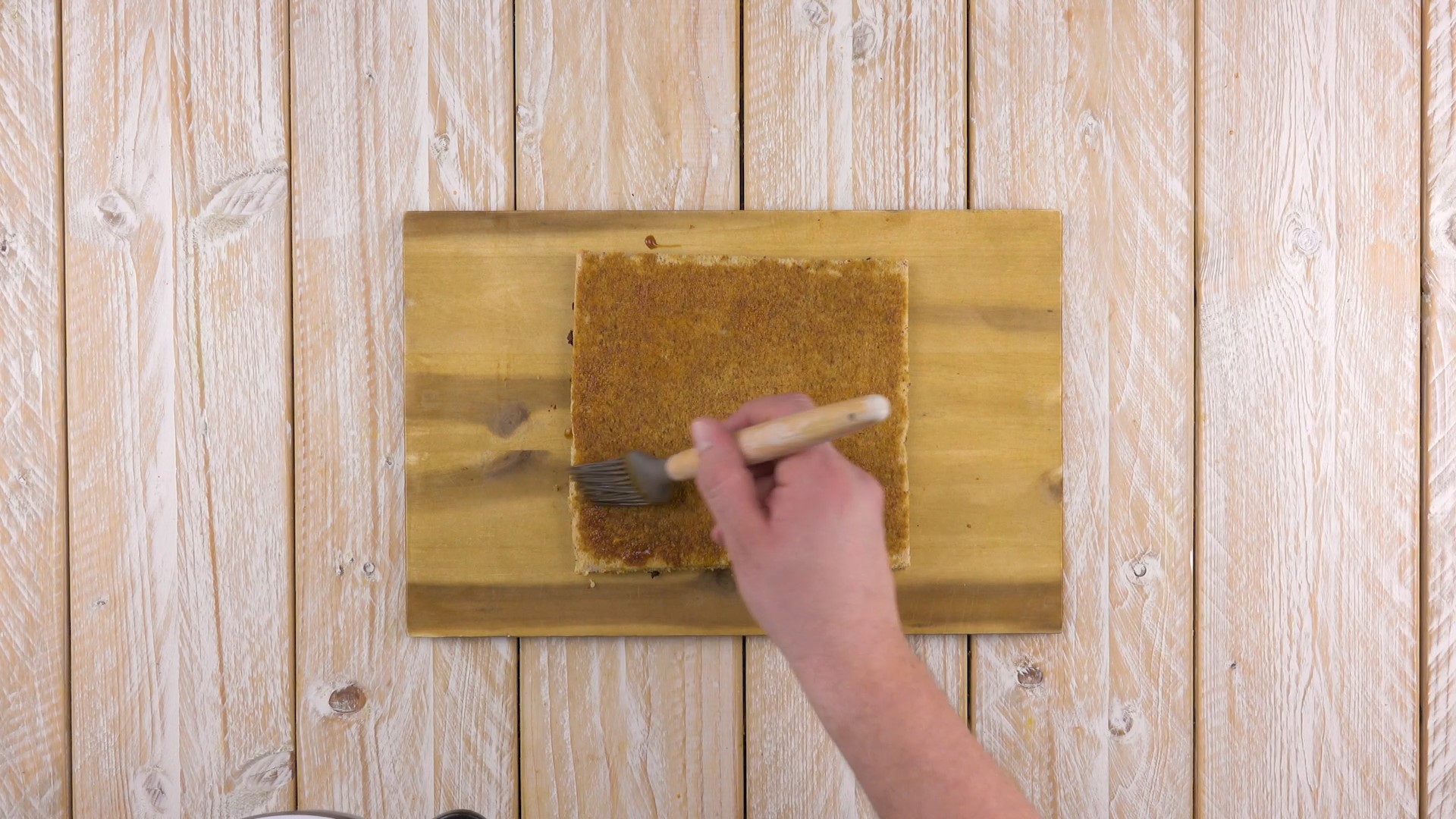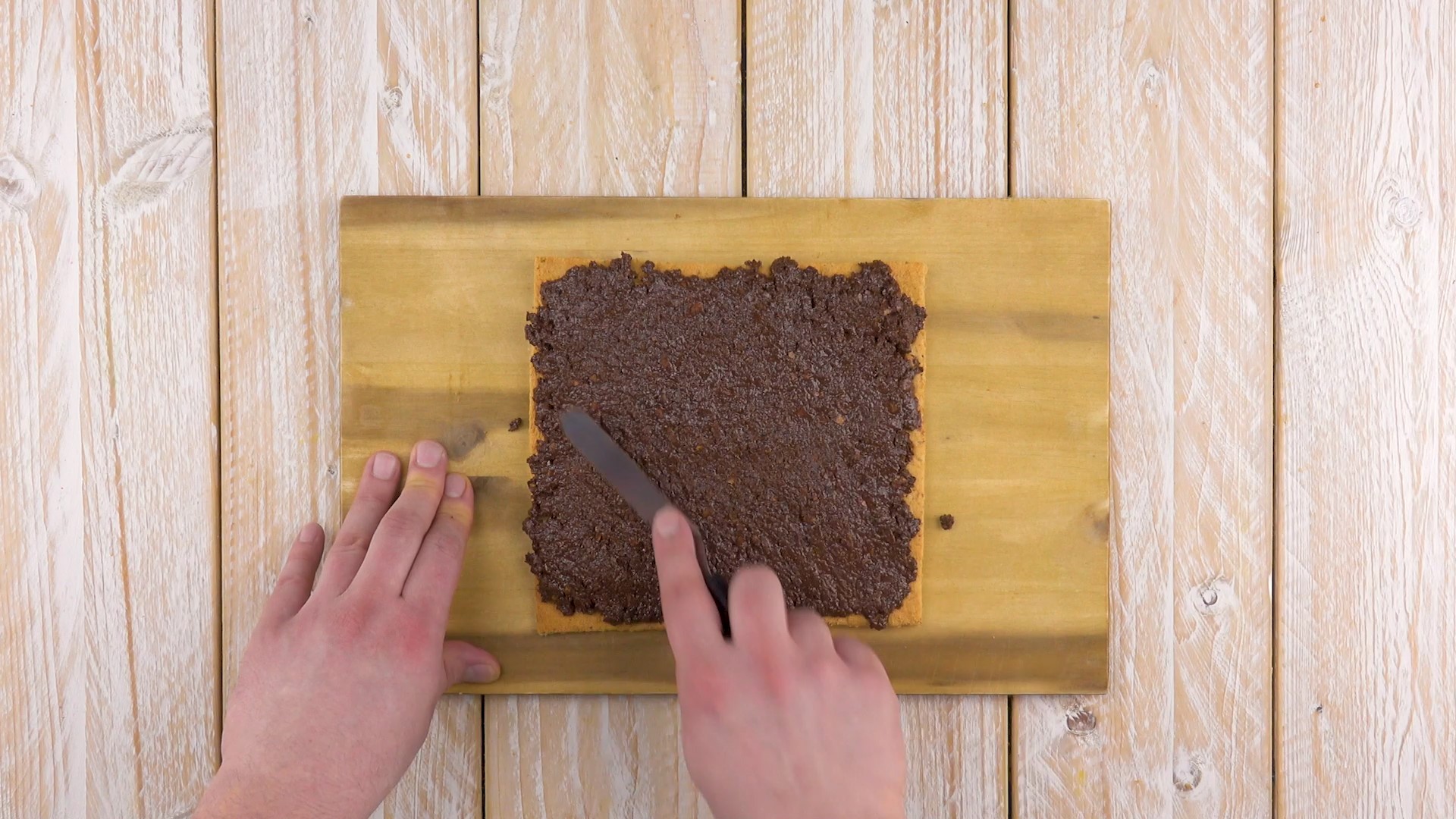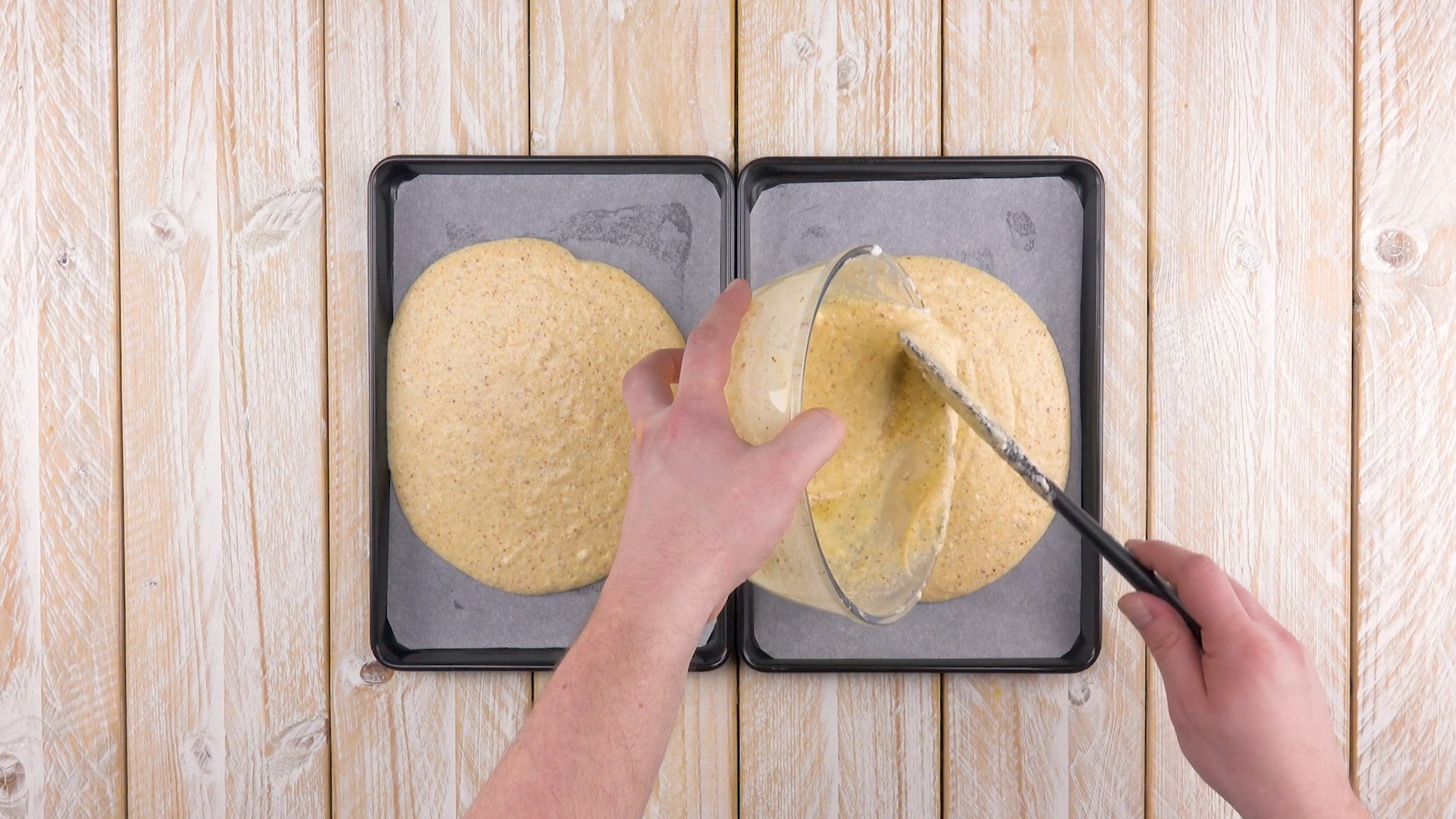 Verteile den Teig dann auf zwei tiefe rechteckige Backbleche (23 x 33 cm), die mit Backpapier ausgelegt sein sollten. Backe beide für 8 Minuten bei 200 °C im Umluft-Modus. Entferne sie anschließend von den Blechen und lass sie auf einem Ofengitter auskühlen.