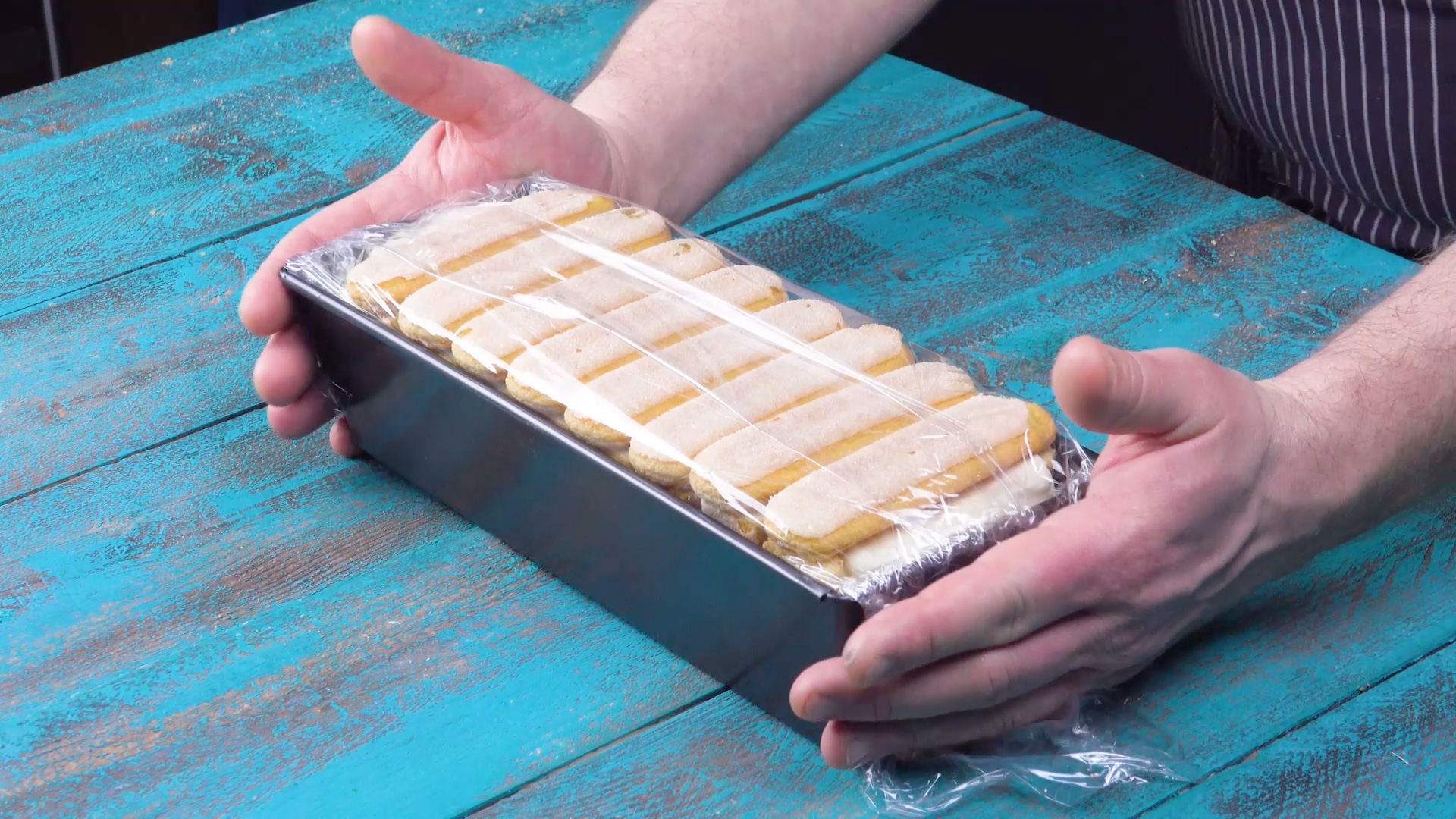 5.) Decke die Creme mit einer Reihe Löffelbiskuits ab. Als Nächstes schlägst du diese in Frischhaltefolie ein und stellst die Form über Nacht kalt.