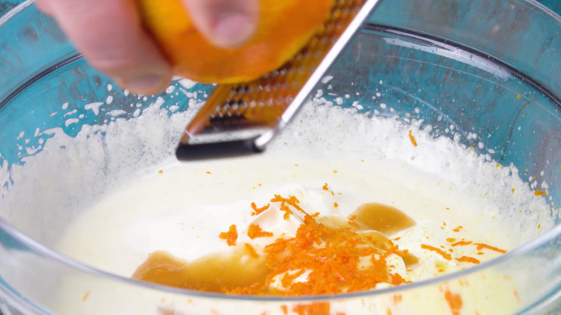 3.) Schlage die Sahne steif. Nun schlage Mascarpone und 150 Gramm Zucker mit einem Handrührgerät auf. Gib Joghurt, Vanille-Extrakt, Orangenschale und Sahne dazu und hebe die Zutaten unter die Masse.