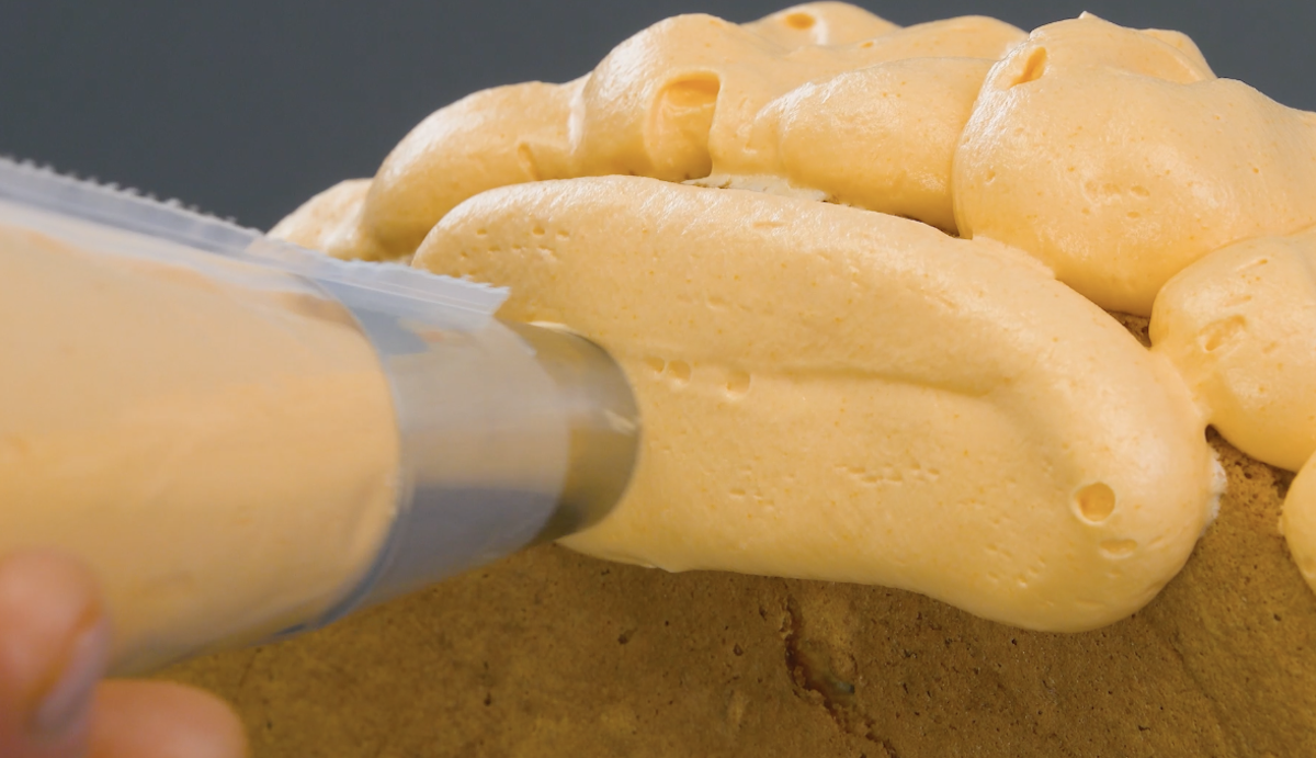 5. Stelle die zuvor beiseitegestellte Kuchenhälfte mit der Schnittkante hochkant auf eine Glasplatte o. Ä. Fülle die Buttercreme in einen Spritzbeutel und kleide die Kuchenhälfte komplett mit Buttercreme ein. Trage zudem vor und hinter dem Kuchen Buttercreme wellenförmig auf der Glasplatte auf.