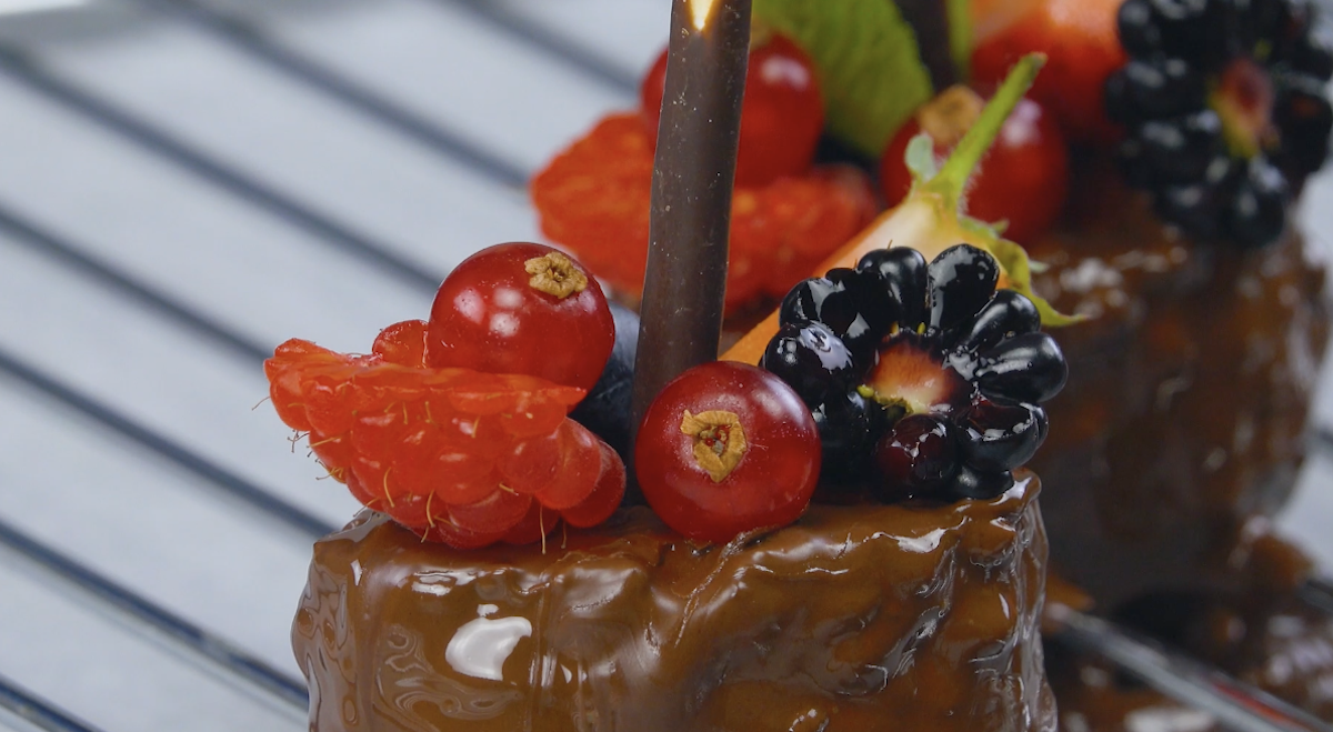3. Stich mit dem Ausstecher aus diesem Teil des Kuchens ovale Kreise aus und übergieße diese komplett mit geschmolzener Kuvertüre. Dekoriere die übergossenen Kuchenstücke mit frischen Beeren und stecke jeweils ein Mikado-Schokostäbchen hinein. Lasse die Schokoladen-Bötchen anschließend für ca. 30 Minuten aushärten.