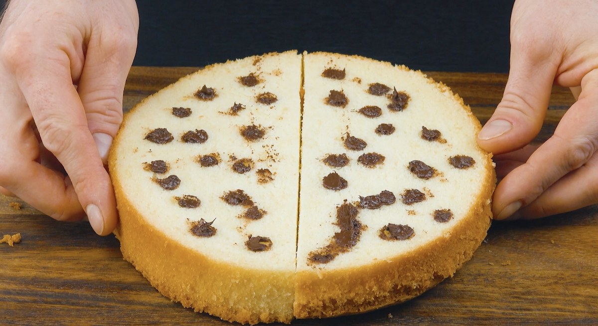 2. Schneide den gebackenen Kuchen in zwei Halbkreise und stelle eine Hälfte erst einmal beiseite. Schneide die andere Hälfte horizontal durch und klappe sie dann auf, sodass wieder eine Kuchenscheibe vor dir liegt.