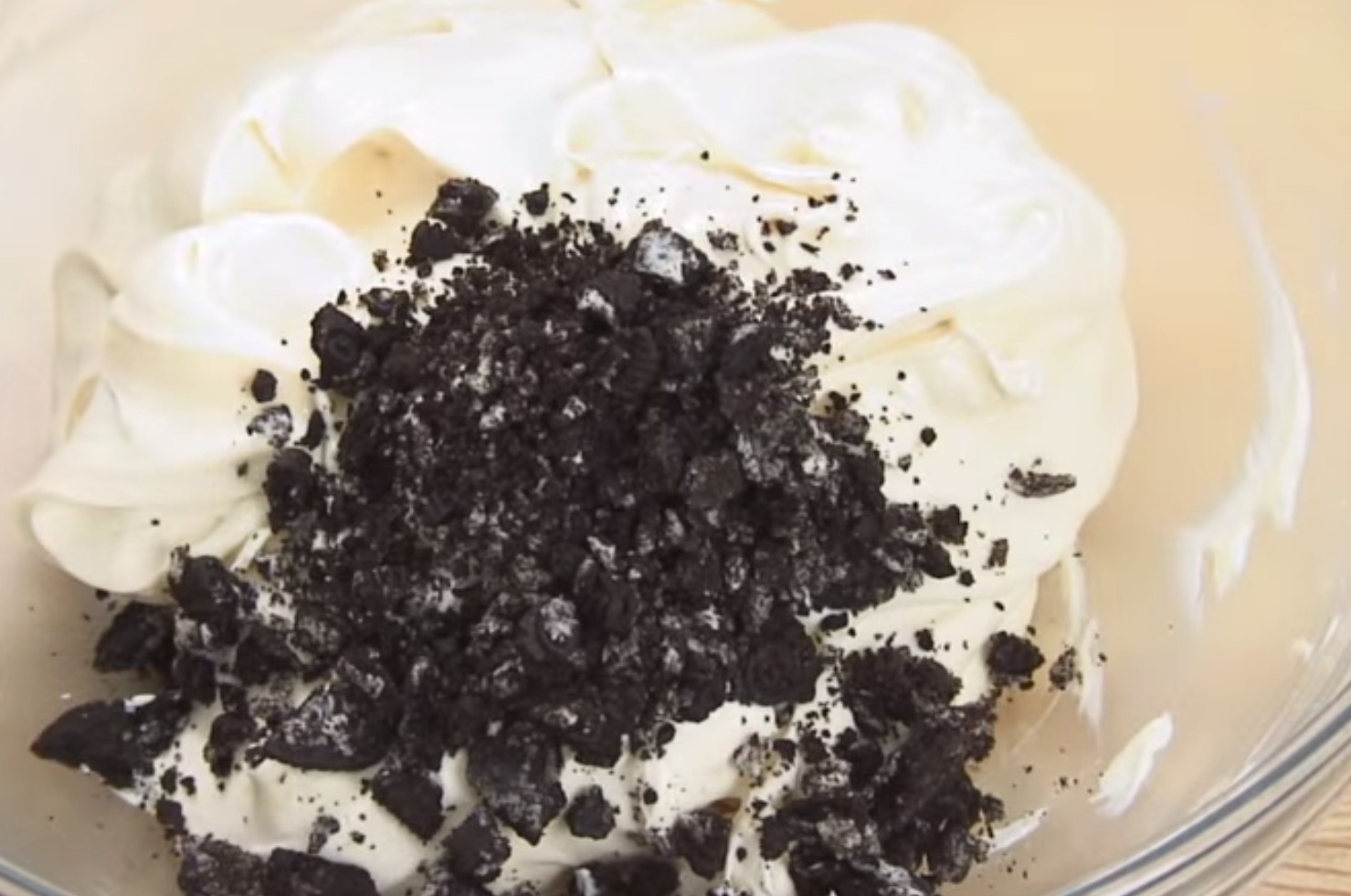 5. Nimm dir ein paar Oreokekse und zerkleinere sie mit der Hand in grobe Stücke. Diese fügst du der cremigen Masse hinzu und vermischst sie vorsichtig.