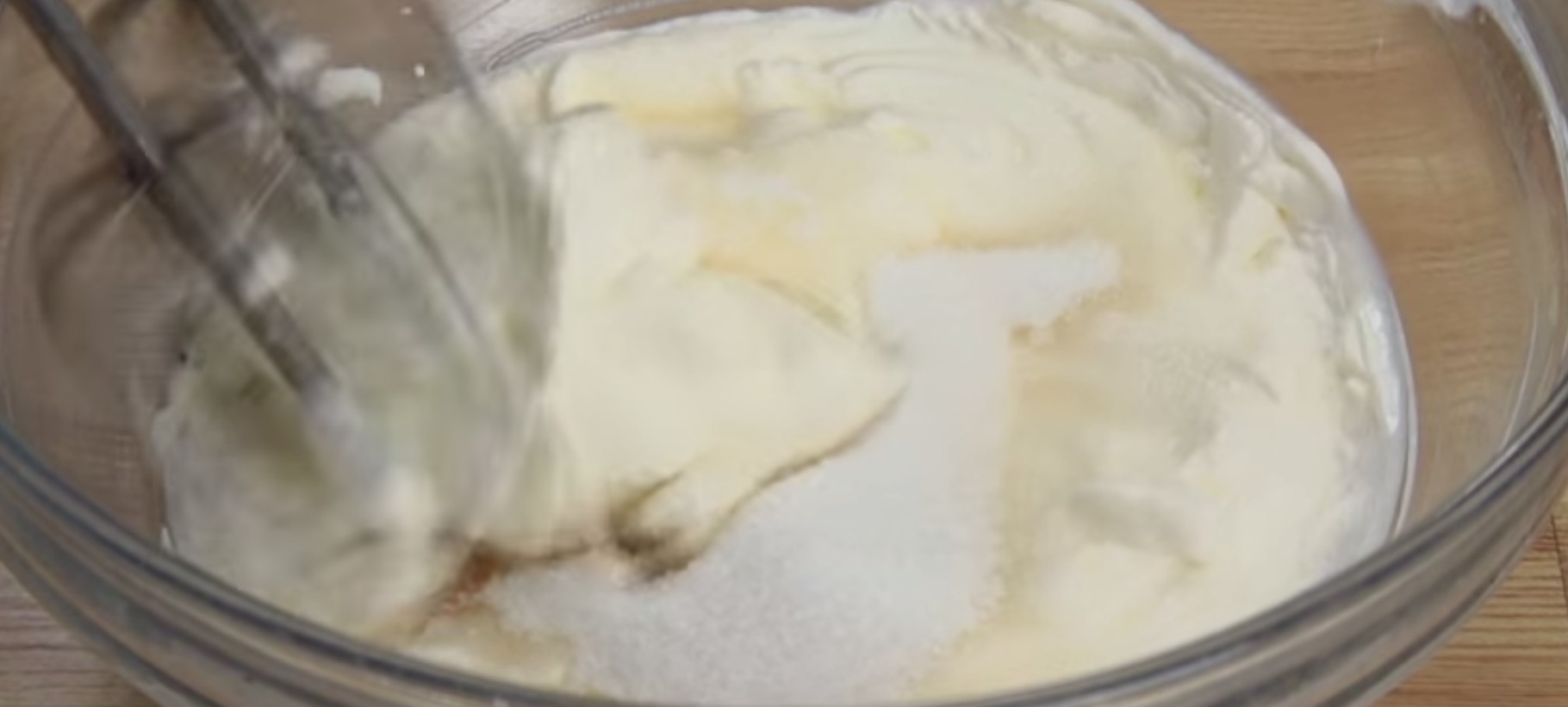 4. In einer weiteren Schüssel 100 g Frischkäse mit 3 Teelöffeln Puderzucker vermengen und 1/4 Teelöffel Vanilleextrakt dazugeben. Dies ebenfalls mit dem Rührgerät vermischen und zusammen mit der Schlagsahne zu einer Mixtur verühren.