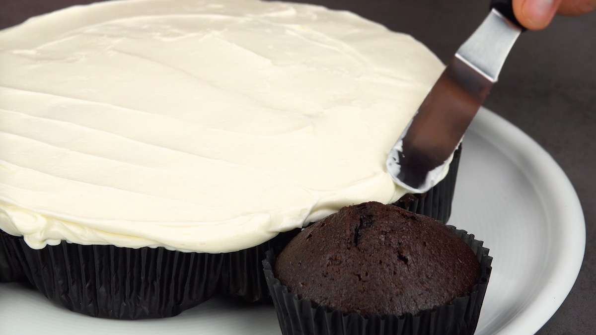 2.3) Löse die Springform und bestreiche den Kuchen mit dem Frischkäse-Frosting. Stelle nun die zwei extra Schokomuffins wie Pandaohren an den Cupake-Kuchen.
