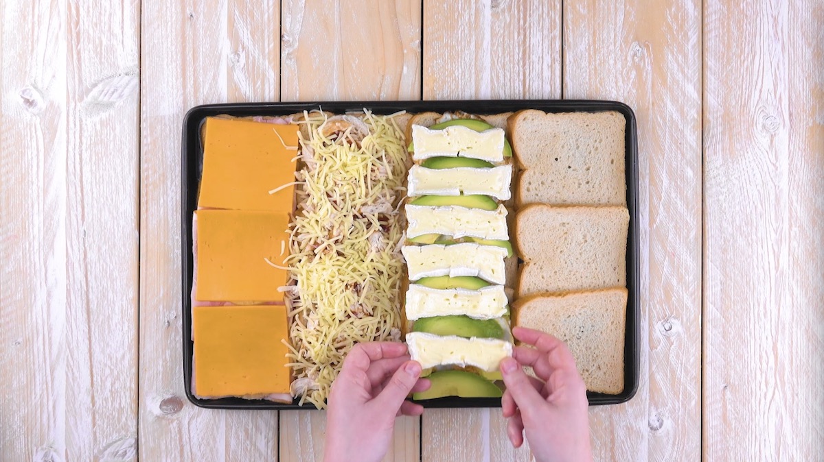 9.) Verteile auf der letzten Toastbrotreihe zunächst drei Scheiben Mozzarella, darüber dann die Rinder- und Paprikastreifen und bedecke das Ganze zum Abschluss mit drei Mozzarellascheiben.