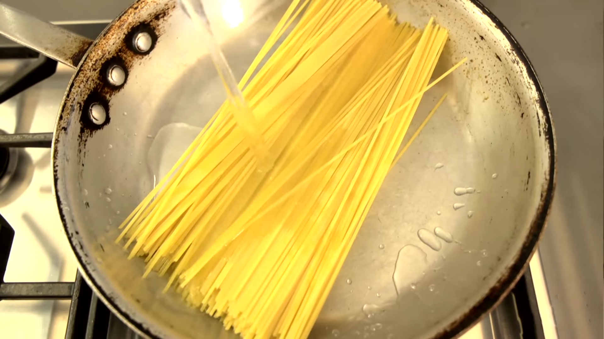 Los geht es damit, dass man die Pasta in eine Pfanne mit dem passenden Durchmesser legt, statt in einen Topf, und dann so viel Wasser hinzugibt, dass die Nudeln vollständig bedeckt sind. Durch die größere Fläche der Pfanne benötigt man viel weniger Wasser. Außerdem kleben die Nudeln nicht zusammen, da sie zuerst in kaltem Wasser schwimmen.
