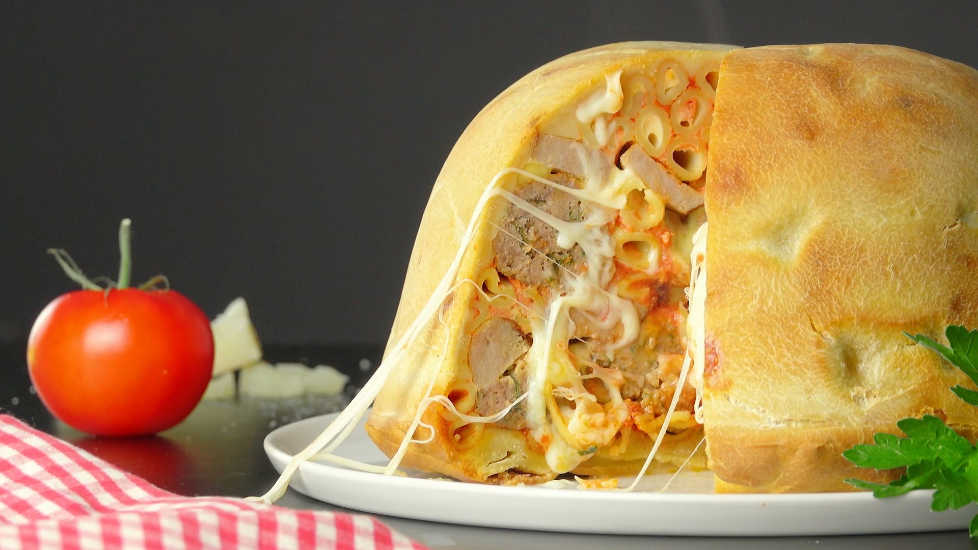 So ein Kunstwerk, das prall gefüllt mit herzhaften Köstlichkeiten ist, bekommt man selten auf den Teller. Und es sieht nicht nur beeindruckend aus, sondern kombiniert auch Pasta, leckere Hackbällchen und Käsespezialitäten in einer knusprigen Teighülle. Besser geht’s nicht.