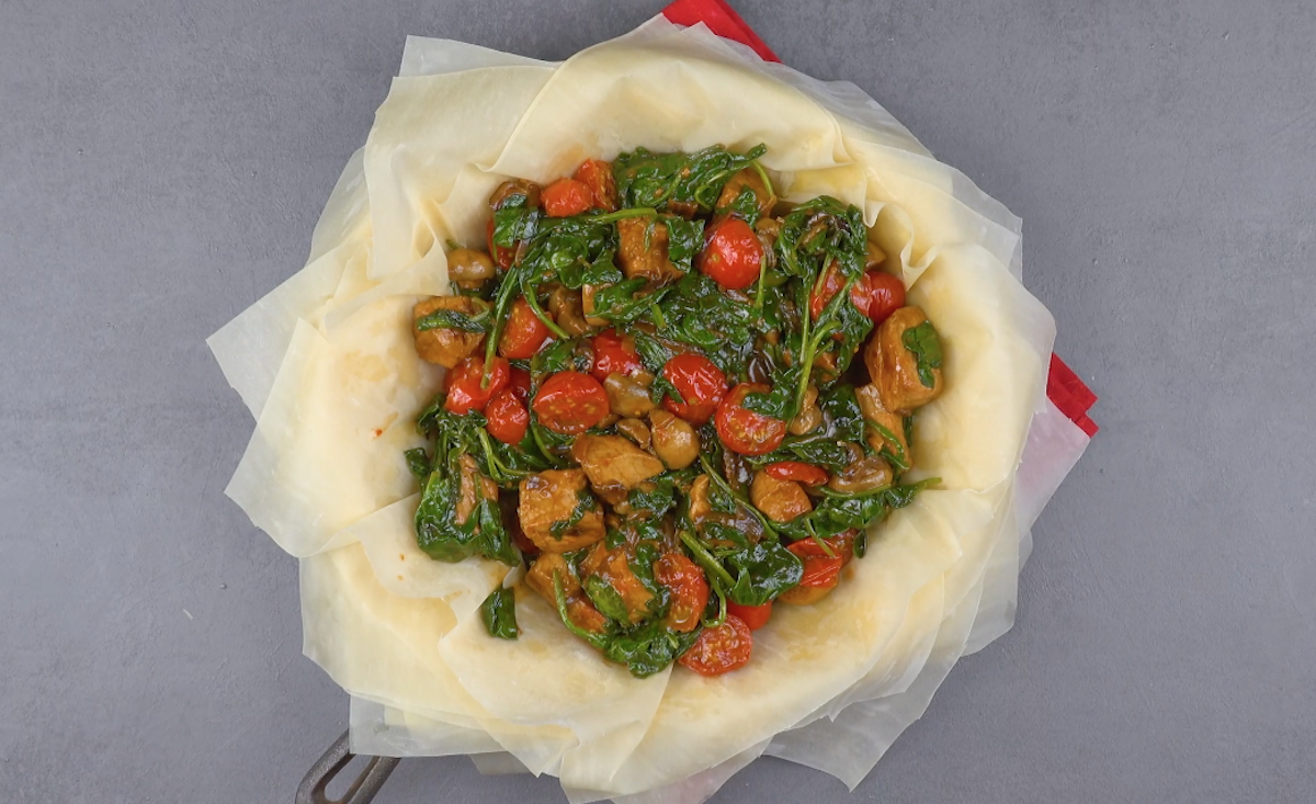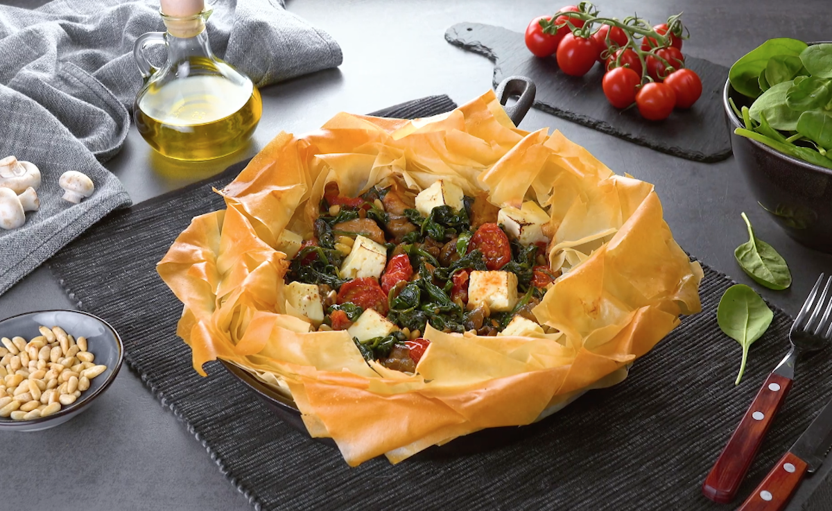 Filoteig ist ein sehr dünner und ungesäuerter Teig, der zum Beispiel bei der Zubereitung von Baklava sowie Börek und vor allem in der Küche des Nahen Ostens und des Balkans verwendet wird. Er erinnert an den hierzulande weitverbreiteten Blätterteig. Im folgenden Rezept haben wir mehrere Schichten Filoteig in einer Pfanne übereinandergestapelt und ihn mit einer köstlichen Mischung aus Schweinefleisch, Gemüse und Käse gefüllt. Nach nur 40 Minuten kannst du deinen Gästen einen schmackhaften Pfannenkuchen servieren.