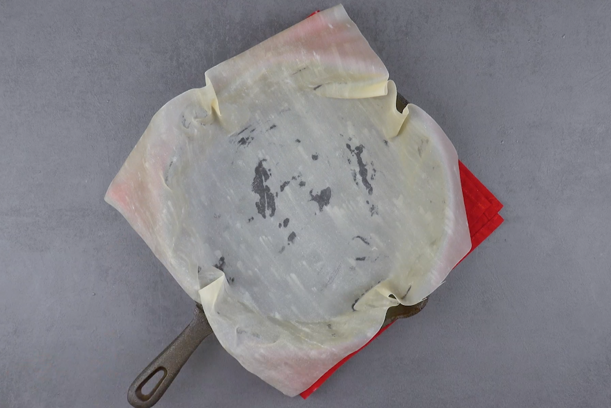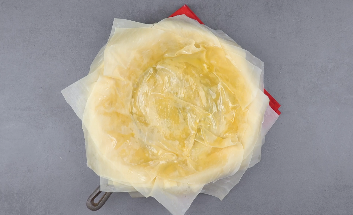3.) Pinsle eine Pfanne dünn mit flüssiger Butter aus und lege ein Blatt Filoteig hinein. Lasse die Ecken aus der Pfanne herausschauen.