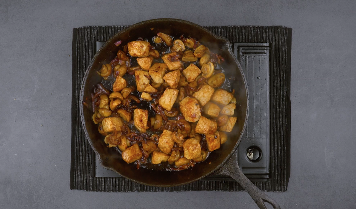 1.) Schneide Schweinefleisch, Champignons, Zwiebeln und Knoblauch klein, brate alles mit Olivenöl in einer Pfanne an und würze es mit Salz, Pfeffer und Paprikapulver.